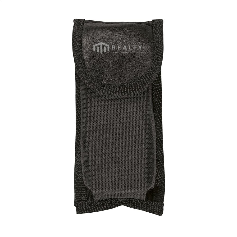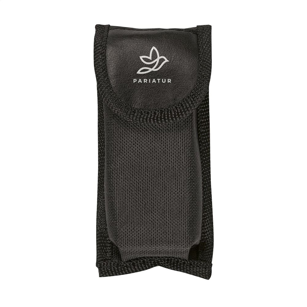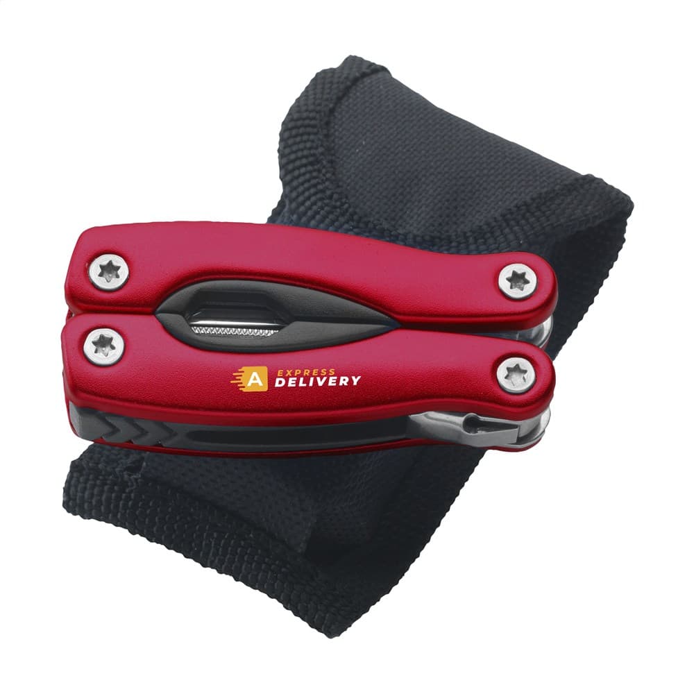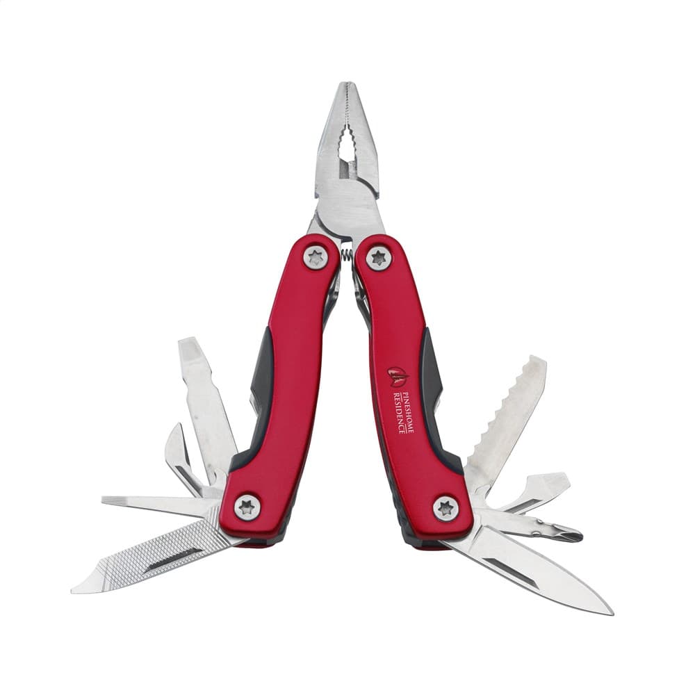 Compacte RVS multitang met aluminium handgreep in metallic look. 9-delig met 13 functies: tang, draadknipper, 3 schroevendraaiers, priem, vijl, blikopener, flesopener, visschraper, visonthaker, mes, philips kruiskopschroevendraaier. Met vergrendeling. In nylon etui. Op het bezit en/of dragen van messen of multitools in het openbaar kunnen lokale regels van toepassing zijn. Per stuk in doosje.
