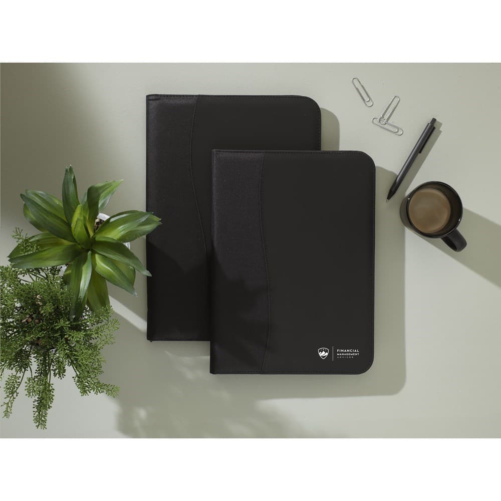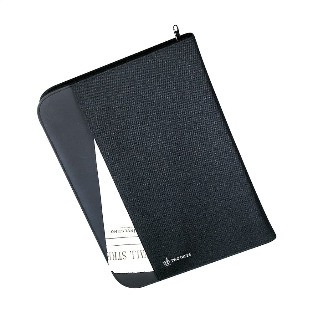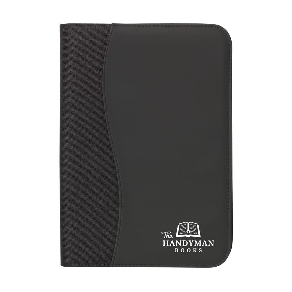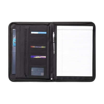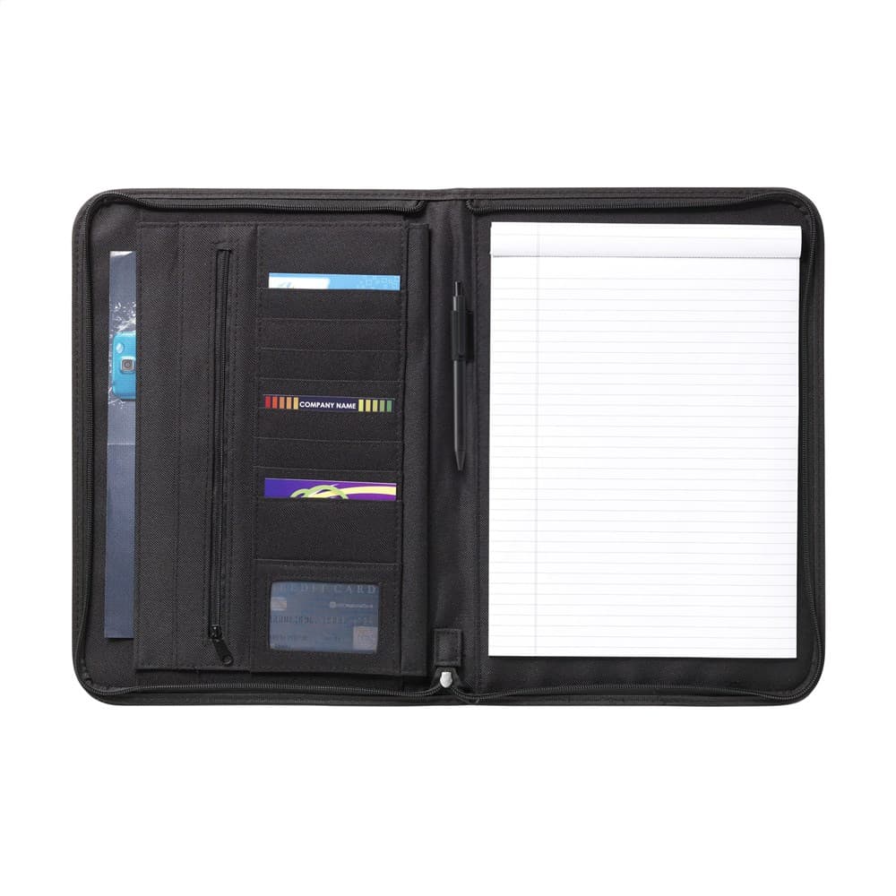 Schrijfmap/documentenmap van 600D polyester/imitatieleer in A4-formaat. Met ruime insteekvakken, extra insteekvak aan de achterzijde en rits rondom. Incl. schrijfblok, balpen en bureauaccessoires.