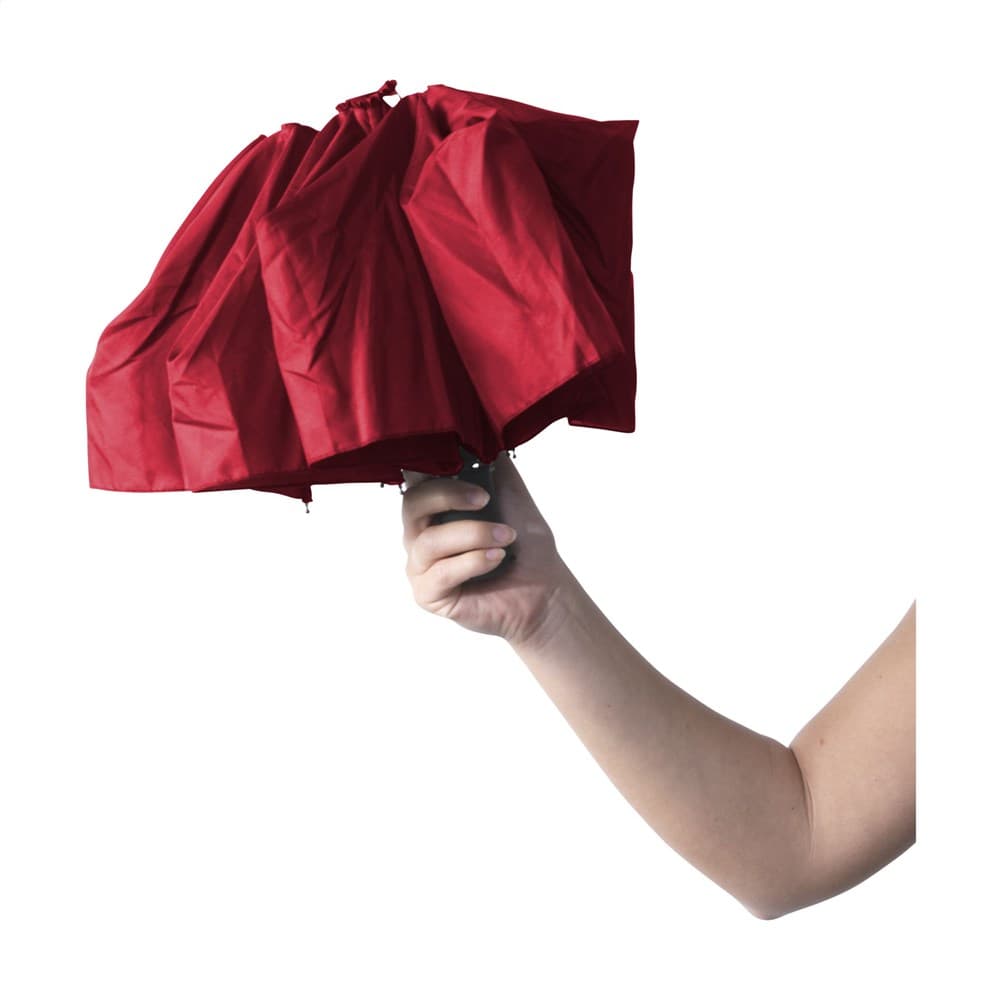 Volautomatische in- en uitklapbare paraplu met 190T pongee bespanning, metalen steel en frame, rubberen handgreep met polslus, klittenbandsluiting en opberghoes. Lengte ingevouwen: 28 cm.
