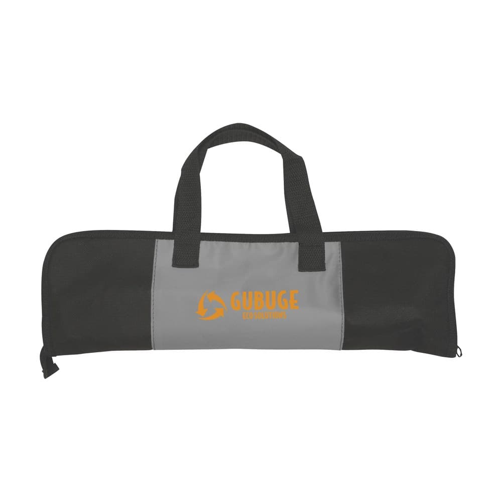 3-delige RVS barbecueset: spatel, vork en vleestang. In nonwoven etui met extra 420D nylon insteekvak op voorzijde.