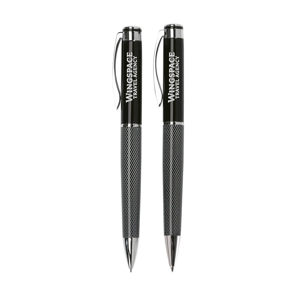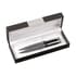 Hoogglans schrijfset: blauwschrijvende balpen met draaikliksysteem en vulpotlood met 3 HB vullingen (0,9 mm). Beide met metalen accenten. In cassette.
