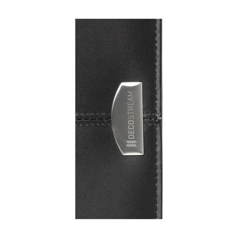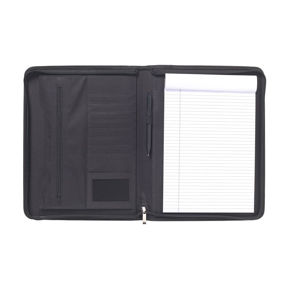 Schrijfmap/documentenmap van fijn gebonden leder in A4-formaat. Met diverse insteekvakken, visitekaartvakjes en rits rondom. Incl. schrijfblok en balpen. Per stuk in kraft doos.