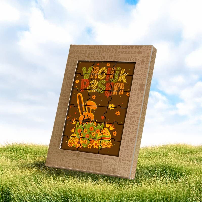 Een leuke puzzel van chocolade met paasbedrukking. De chocolade puzzel bestaat uit 18 puzzelstukjes en is leuk om weg te geven als cadeau of relatiegeschenk. Deze puzzel is geproduceerd van topkwaliteit Belgische chocolade en is verpakt in een luxe vensterdoosje. Afmetingen: 165 x 220 x 19 mm. Gewicht: 150 gram. Op verzoek is er een brievenbus geschikt verzenddoosje mogelijk. Prijs op aanvraag. Besteleenheid: 12 stuks. Uiterste besteldatum: 17-03-2025. Leverbaar vanaf 10-04-2025.
