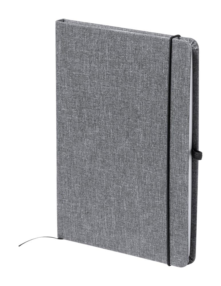 600D RPET polyester notitieboek met 100 gelinieerde vellen, bladwijzer en rubberen band. A5 formaat.