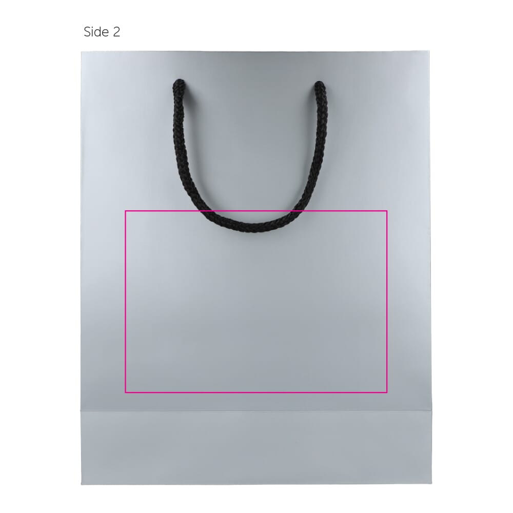 Elegante cadeautas gemaakt van papier, met 5 mm dikke handvatten van gerecycled polyester. Ontworpen om tot 5 kg te dragen, met een luxe uitstraling door de zwarte handvatten en een zwarte binnenafwerking. Perfect voor het presenteren van cadeaus.