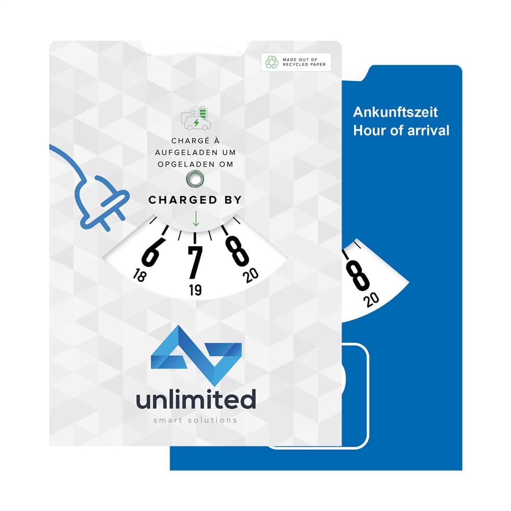 WoW! Parkeerschijf en oplaadschijf in één. Geschikt voor elektrische auto's. Met aan een zijde een oplaadschijf met oplaadtijdsaanduiding. Deze gebruik je bij het opladen van je elektrische auto aan een openbare laadpaal. Hiermee maak je aan andere elektrische rijders kenbaar wanneer de accu van je auto voldoende opgeladen is. Op die manier weet iedereen wanneer het laadpunt vrijkomt en kan iedereen optimaal gebruik maken van openbare laadpunten. De andere zijde heeft een normale parkeerschijf voor blauwe zones. De schijf is gemaakt van gerecycled papier en de tekst wordt in meerdere talen weergegeven. Inclusief full colour opdruk op zijde oplaadschijf. Made in Germany.