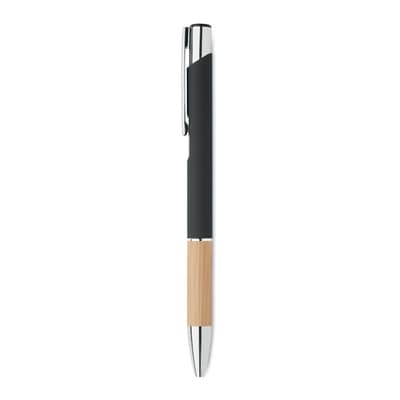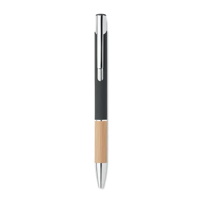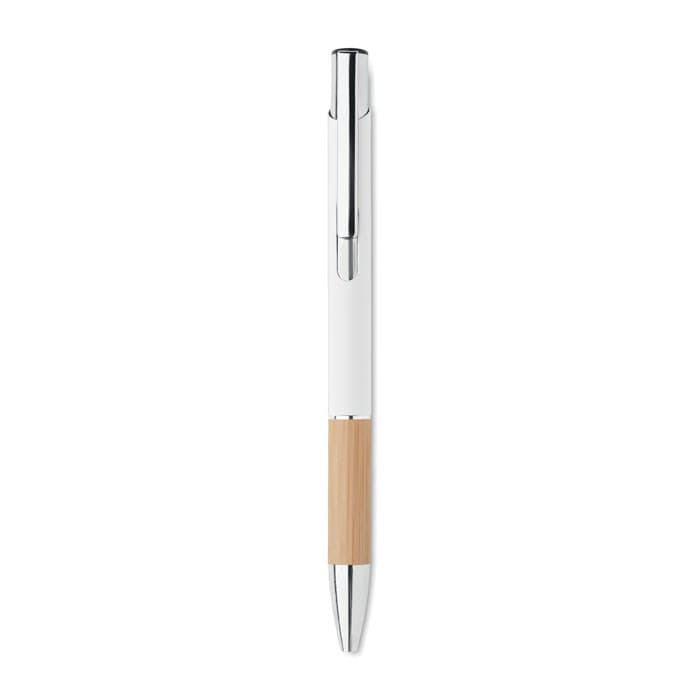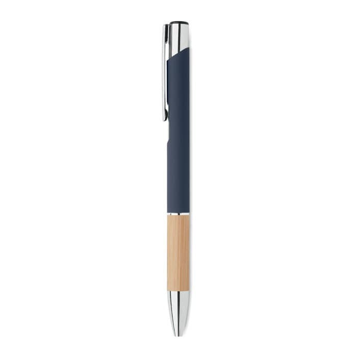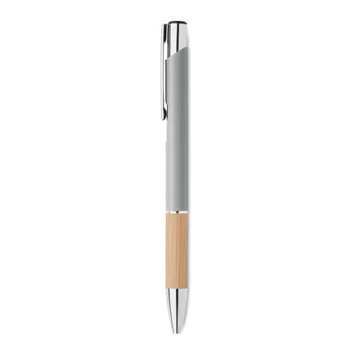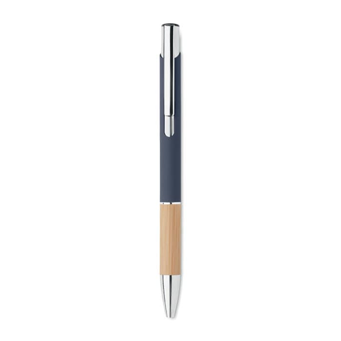 Pen met aluminium uiteinden en bamboe grip. Blauwe inkt.
