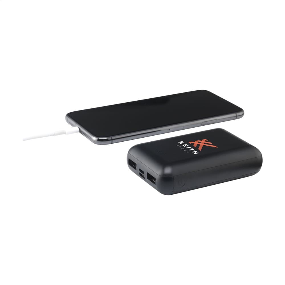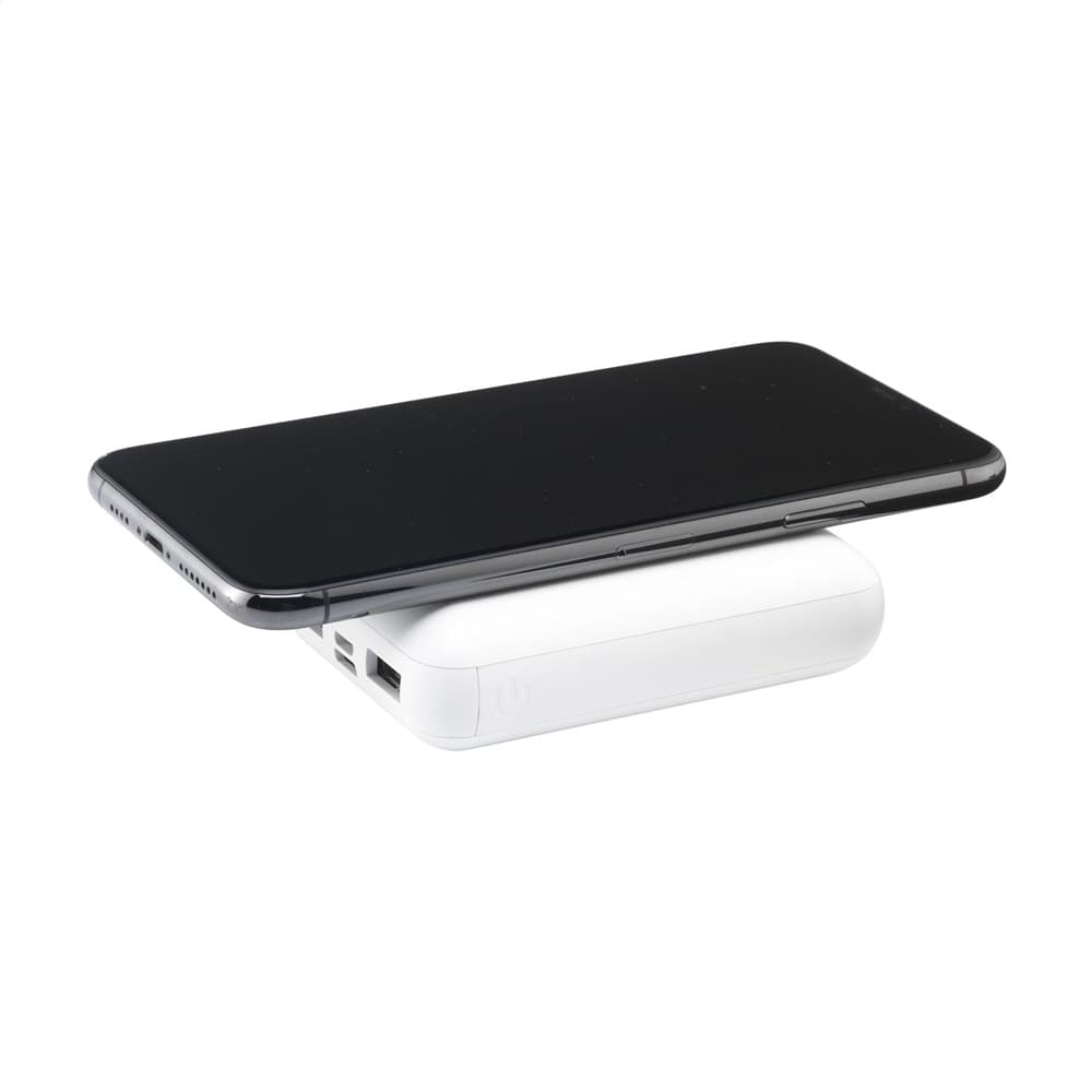 Kleine, lichte en zeer krachtige wireless charging (5W) powerbank van gerecycled ABS met ingebouwde lithiumpolymeer batterij (10.000mAh). Deze krachtpatser past gemakkelijk in je broekzak waardoor je hem comfortabel overal mee naar toe kunt nemen. Ondanks het geringe formaat draag je genoeg power met je mee om je telefoon veelvuldig op te laden via de 2 USB poorten of de geïntegreerde 5W wireless laadfunctionaliteit (ondersteunt draadloos opladen van mobiele apparaten die QI draadloos laden ondersteunen). Input 5V/2A. 2x Output: 5V/2A. Draadloze output: 5W. Met indicatielampjes en aan/uit knop. Inclusief Type-C oplaadkabel, USB-C connector en gebruiksaanwijzing. Per stuk in doos.