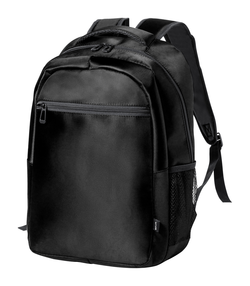 RNYLON-rugzak met ritsvakken, mesh zijvakken, gewatteerd laptopvak (15"), trolleyriem, gewatteerde rug- en schouderbanden. 420D gerecycled nylon met onderscheidend RNYLON-label.