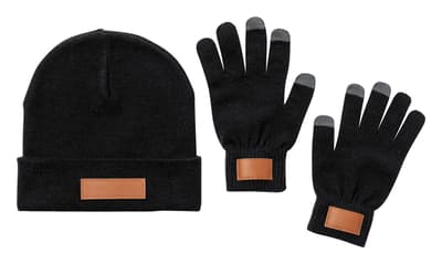 Gebreide winter muts en handschoenen met touchscreen van acryl met bedrukbare PU-leren patches, in één maat voor volwassenen.