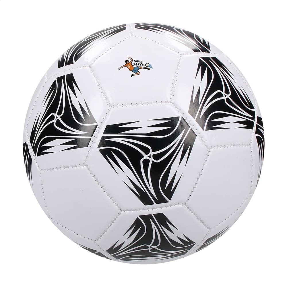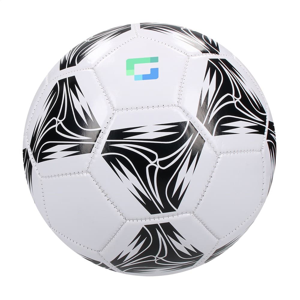 Promotionele voetbal met een sportief design. De 3-laags voetbal van glanzend PVC in maat 5 heeft 32 panelen. De bal heeft een dikte van 2,0 mm, een butyl ventiel en een latex binnenbal. Machinaal genaaid. De bal is niet opgepompt bij levering.