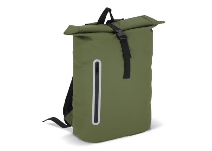 Deze rugzak met roltop is gemaakt van gerecycled PET met PU-coating in 600D-materiaal. Voorzien van reflecterende strips op de schouderbanden en rond het voorvak voor extra veiligheid in het donker. Met handvat, verstelbare gewatteerde schouderbanden en een gewatteerd laptopvak.