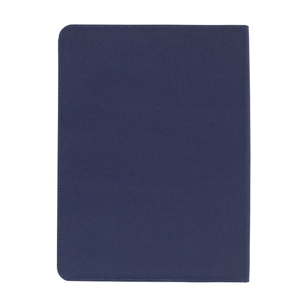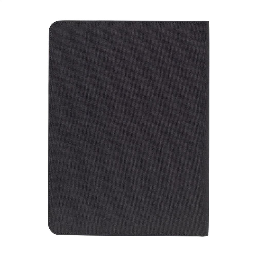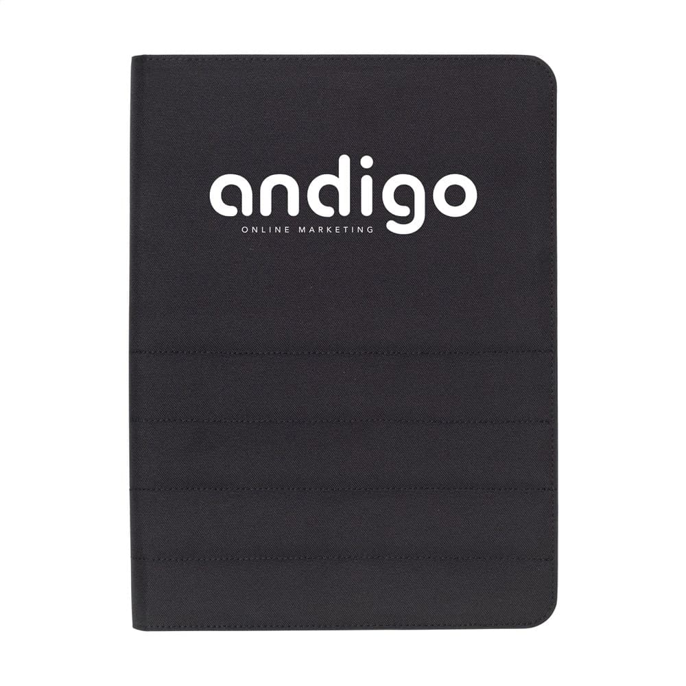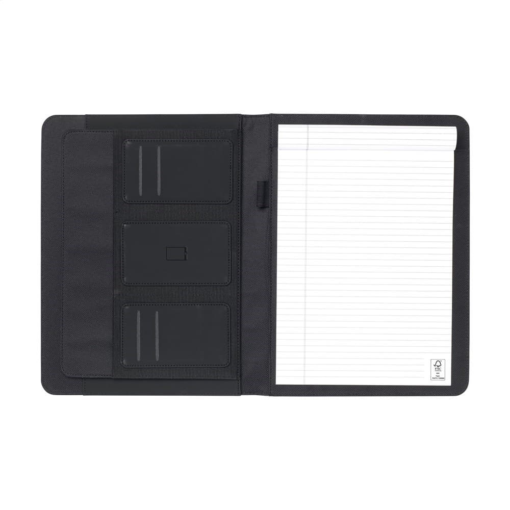 WoW! Moderne A4-schrijfmap/documentenmap gemaakt van RPET. Met stevige, gewatteerde omslag. Aan de binnenzijde voorzien van een pennenlus, diverse insteekvakken, waaronder een apart vak voor het opbergen van een mobiele telefoon en creditcardvakjes. Incl. schrijfblok met 30 vel gelinieerd papier (70 g/m²). Een duurzaam en milieuvriendelijk product.