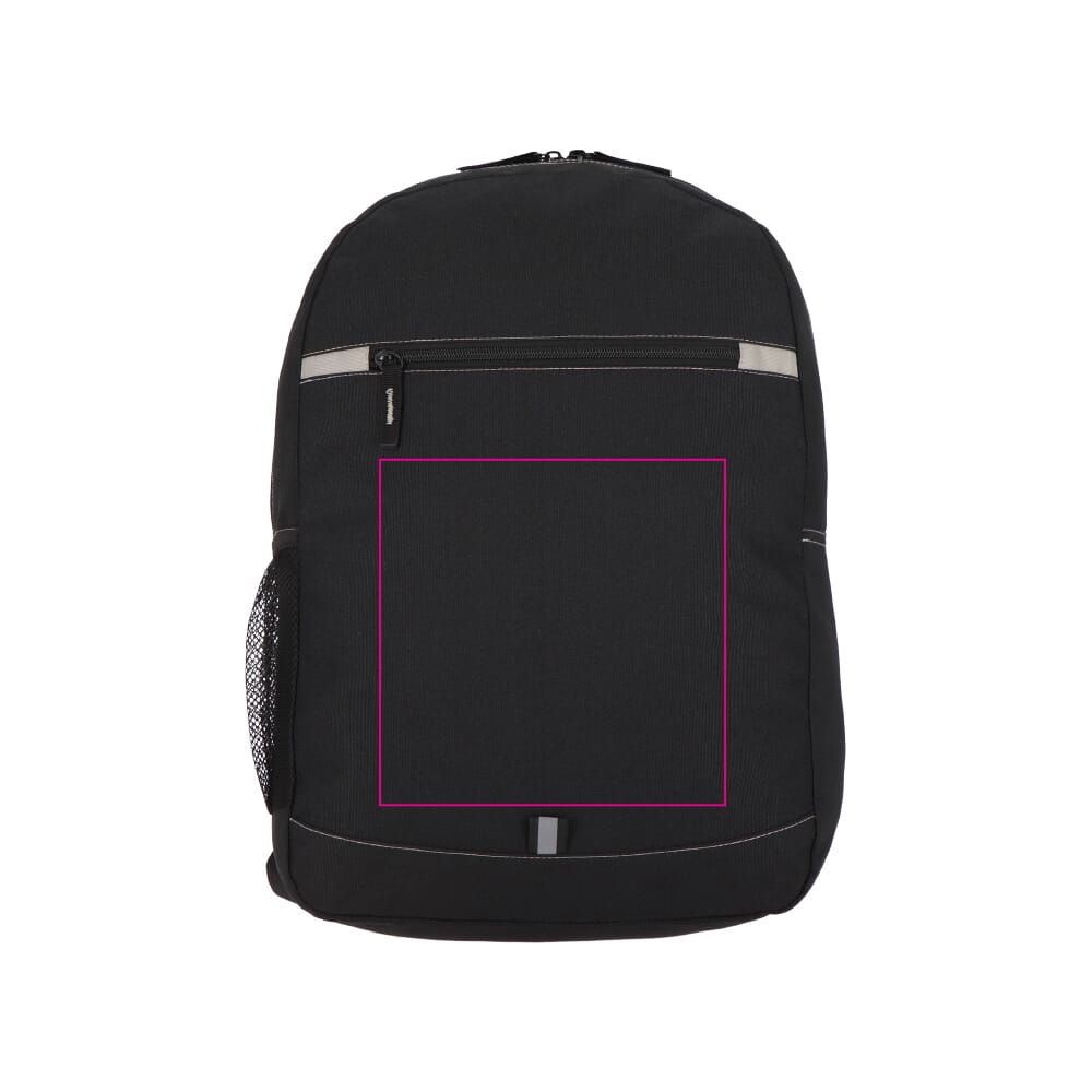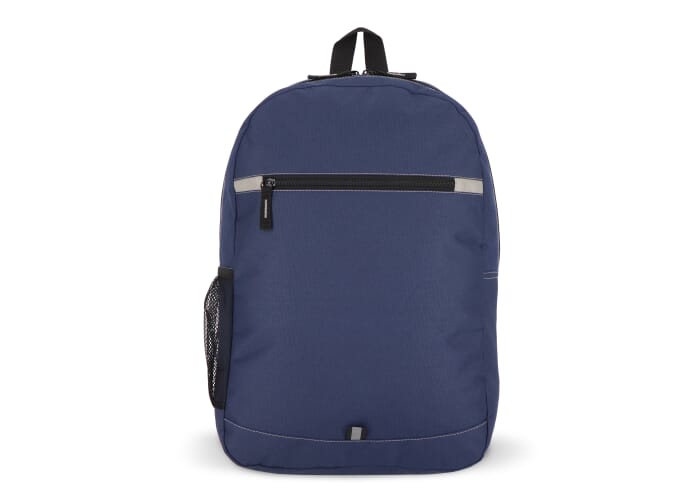 Deze rugzak is gemaakt van gerecycled PET. Hij heeft verstelbare gewatteerde schouderbanden, een handvat aan de bovenkant, een voorvak met ritssluiting, een zijvak van gaas en een kleine reflecterende strip voor zichtbaarheid 's nachts.