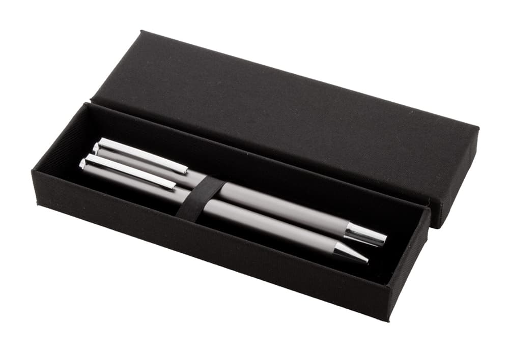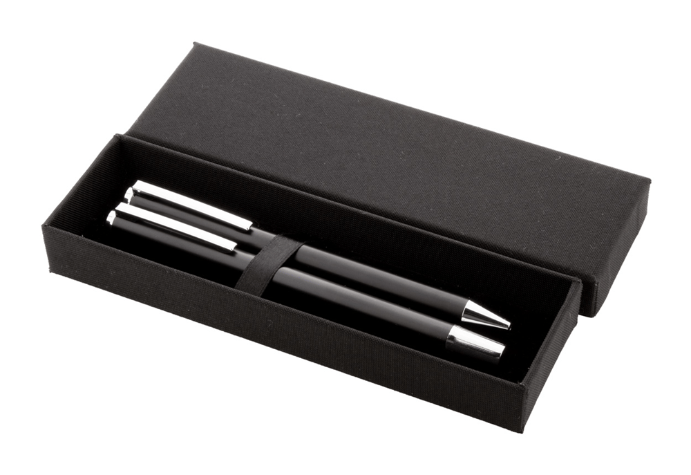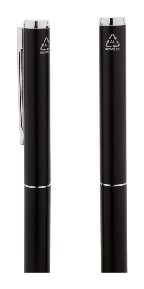 Gerecycled aluminium pennenset met roller en balpen in zwarte papieren geschenkverpakking. Blauwschrijvend.