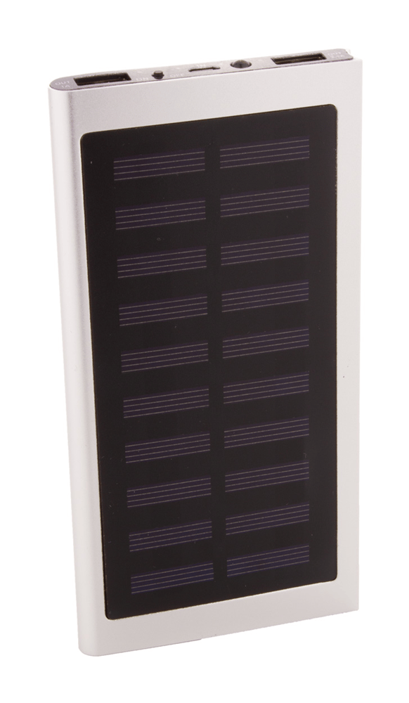 USB powerbank in gerecycled aluminium behuizing met ingebouwde zonnelader en 4000 mAh batterij. Met 2 USB- en 1 USB-C-oplaadpoorten. USB-C-invoerpoort. Inclusief USB-oplaadkabel.