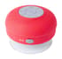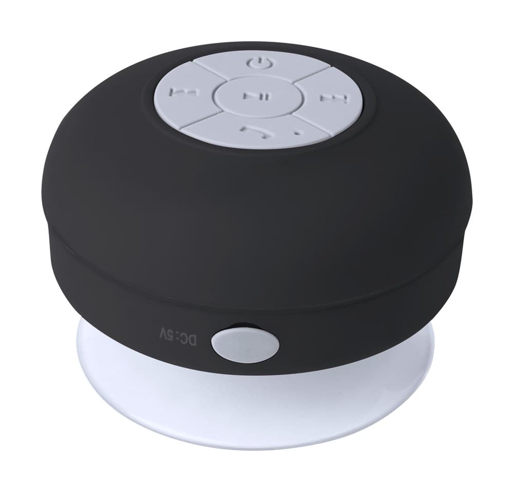 Spatwaterdichte (IPX4 bescherming) bluetooth speaker met rubber-gecoate behuizing en grote zuignap. Met Handfree bel functie en oplaadbare accu. Incl. USB oplaadkabel.