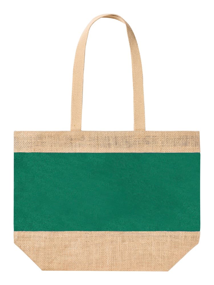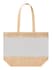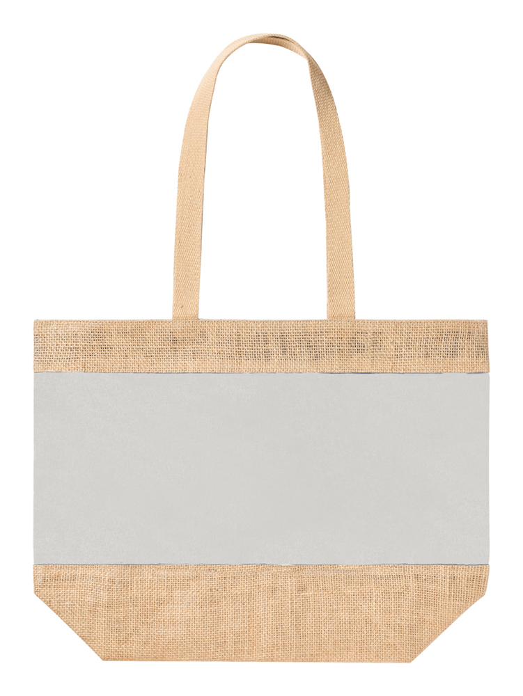 Gekleurde strandtas in combinatie van gelamineerd jute en gelamineerd katoen met lange hengsels.