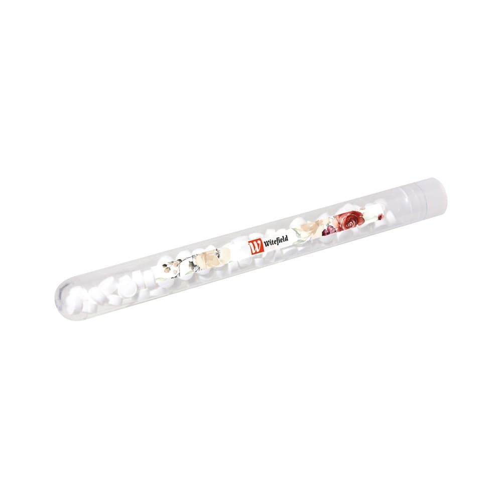 Reageerbuisje voorzien van een full colour bedrukking, gevuld met ca. 9 gram mini mints. Andere vullingen zijn op aanvraag leverbaar.