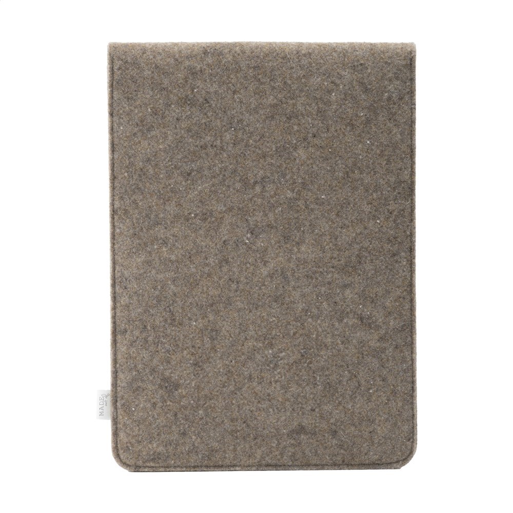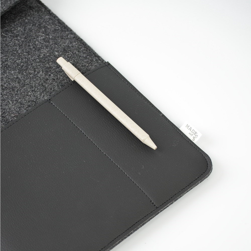 Een eenvoudige maar stijlvolle 16 inch laptop sleeve gemaakt van gerecycled wolvilt en vegan leer. Een product van het merk MADE out of. Het wolvilt is vervaardigd uit 50% gerecycled materiaal, 30% wol en 20% PE. De sleeve heeft een overslag met drukknoopsluiting en is voorzien van 2 insteekvakken aan de voorzijde. Deze zijn gemaakt van mooi vegan leer dat gemaakt is van gerecycled appelpulp. Het heeft de look and feel van echt leer en ze geven de sleeve een luxe uitstraling. Geschikt voor het opbergen en veilig vervoeren van een laptop tot 16 inch. Dit topproduct is handgemaakt. Dutch design. Made in Holland.