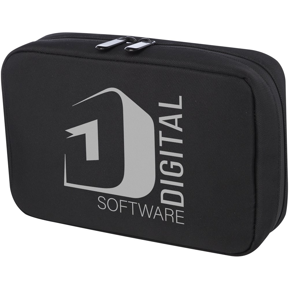 De Rise organizertas is een veelzijdige en hybride oplossing om alle technologiegerelateerde items te ordenen. Deze hardshelltas is gemaakt van duurzaam 900D GRS-gerecycled polyester en heeft een GRS-gerecycled fluwelen voering, twee zakken, mesh-zakken, elastische banden aan de onderkant voor kabels en een ritsvak voor extra accessoires. Alle zakken zorgen voor een optimale organisatie en de harde buitenkant beschermt alle waardevolle gadgets.