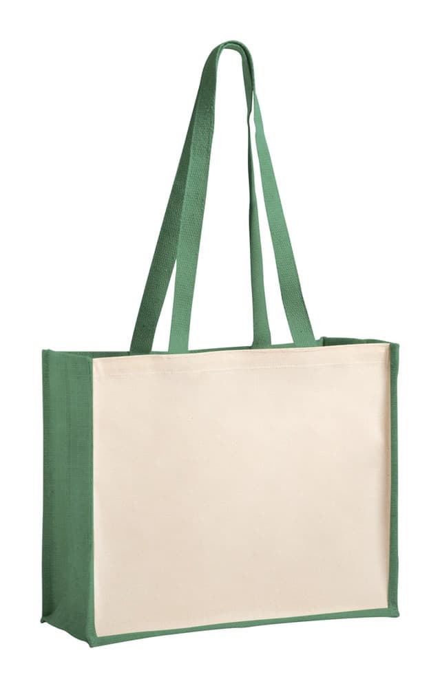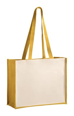 Boodschappentas in combinatie van gelaagd jute en gelamineerd katoen met lange hengsels.