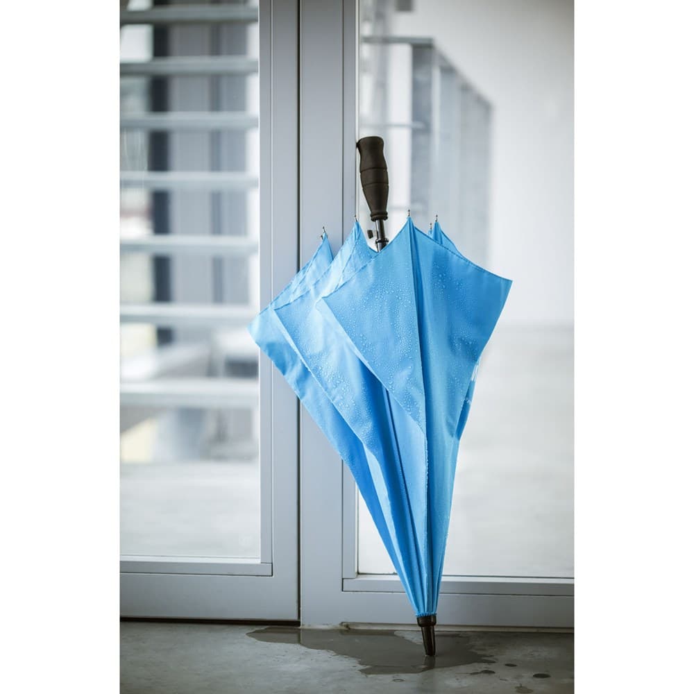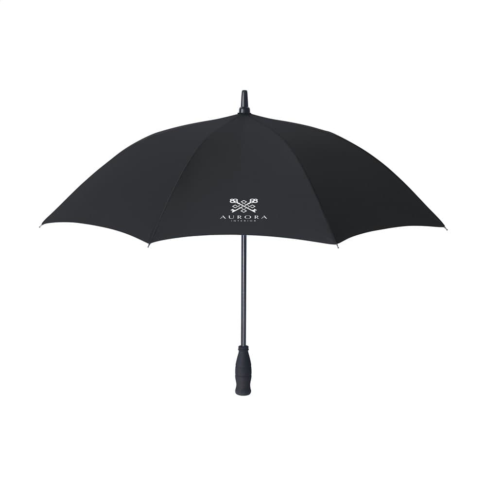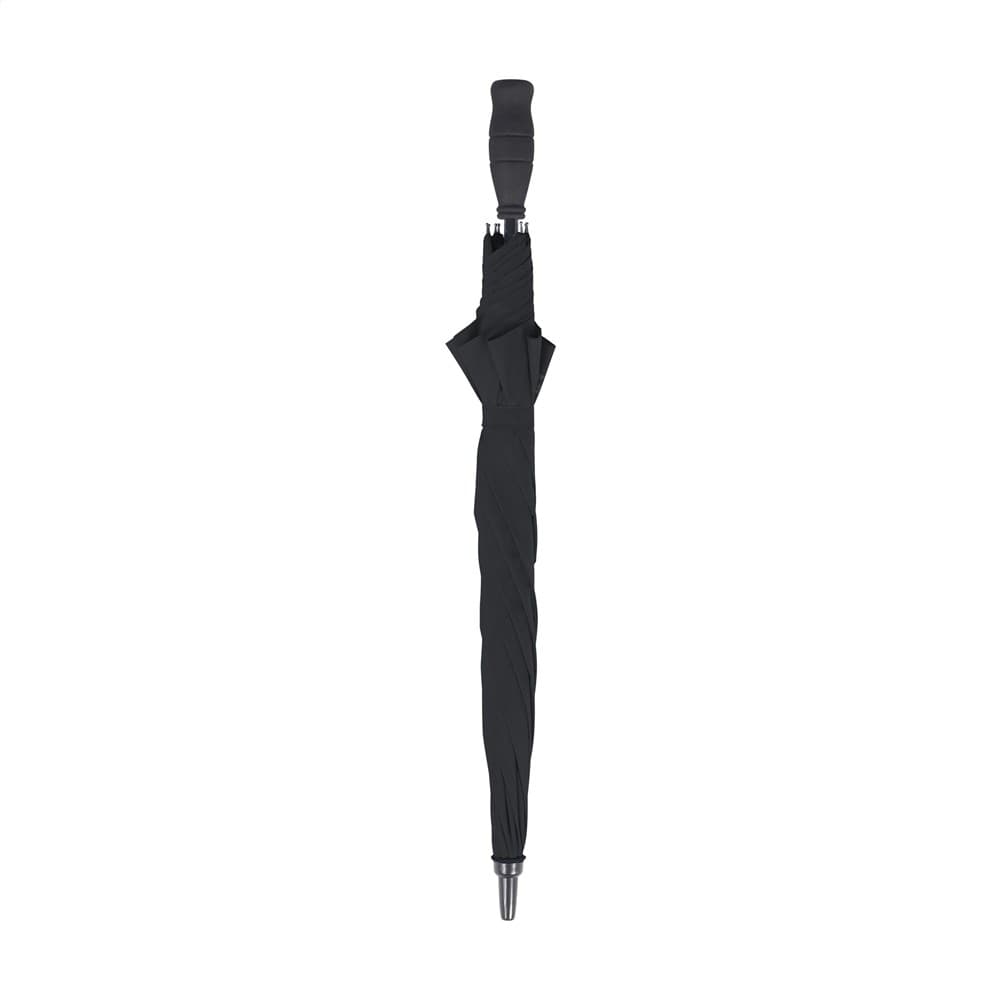 Paraplu met een RPET 190T pongee polyester bespanning. Deze paraplu heeft een metalen steel en een glasvezel frame. Met soft foam handgreep en klittenbandsluiting. Deze duurzame paraplu is deels gemaakt van gerecylede PET-flessen en levert een positieve bijdrage aan het milieu.