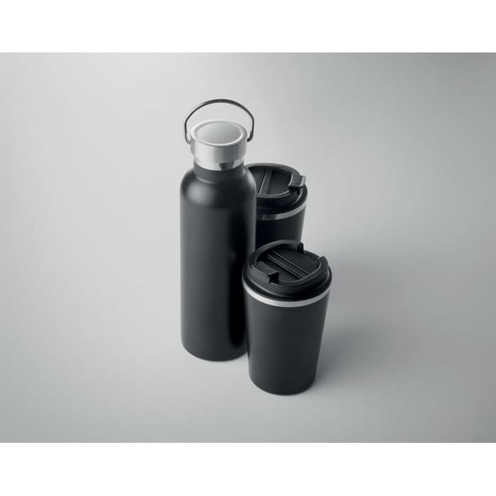 Set van dubbelwandige roestvrijstalen lekvrije fles (inhoud 750 ml) met handvat en 2 roestvrijstalen tumblers (350 ml).