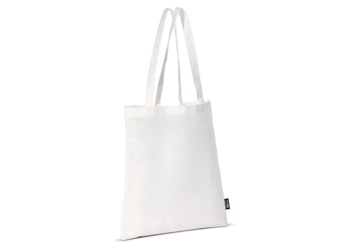 Witte non-woven schoudertas met lange hengsels gemaakt van lichte vezels. Vanaf 10.000 stuks diverse afmetingen mogelijk.