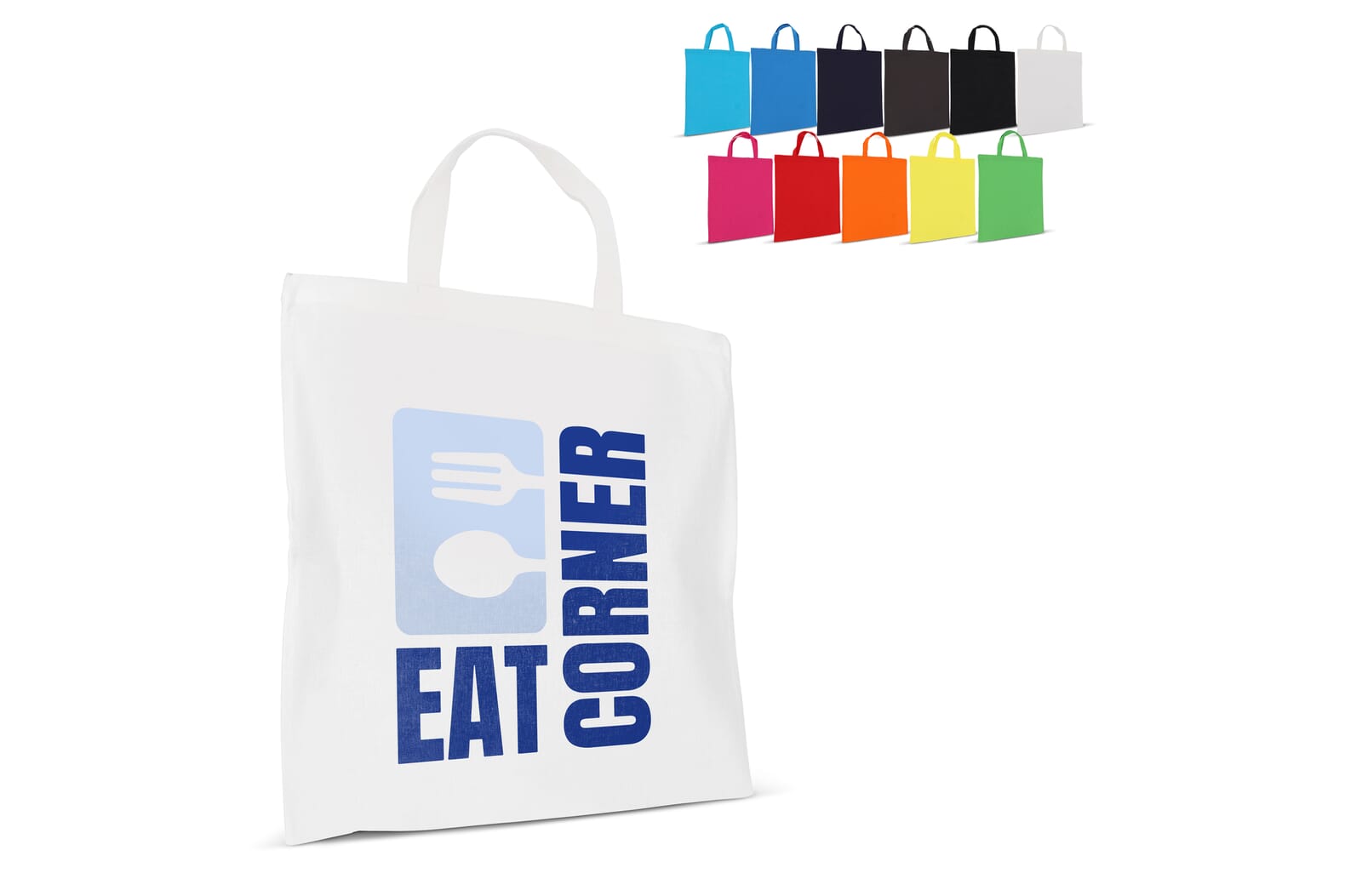 Klassieke katoenen schoudertas met kortere hengsels, ideaal voor promotionele activiteiten en conferenties. Deze tas is OEKO-TEX® gecertificeerd, waardoor het een duurzame keuze is.