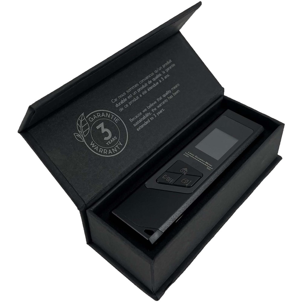 De mini-lasertelemeter is een eenvoudiger, snellere en nauwkeurigere manier om oppervlakte en volume te meten en heeft ook een Pythagoras-functie. Met zijn laserprecisietechnologie en realtime meetmodus biedt hij betrouwbare metingen tot 40 meter. De telemeter gebruikt een energiebesparende 200 mAh li-ionbatterij als voeding en kan na volledig opladen 2000 keer de afstand meten. Hij heeft een scherm met achtergrondverlichting zodat je het gemakkelijk kunt bekijken, zelfs in donkere gebieden. Afmetingen: 9 x 2,4 x 1,1 cm. Verpakt in een geschenkverpakking van gerecycled papier (10,2 x 4,2 x 3 cm) met magnetische sluiting. Inclusief 3 jaar garantie.