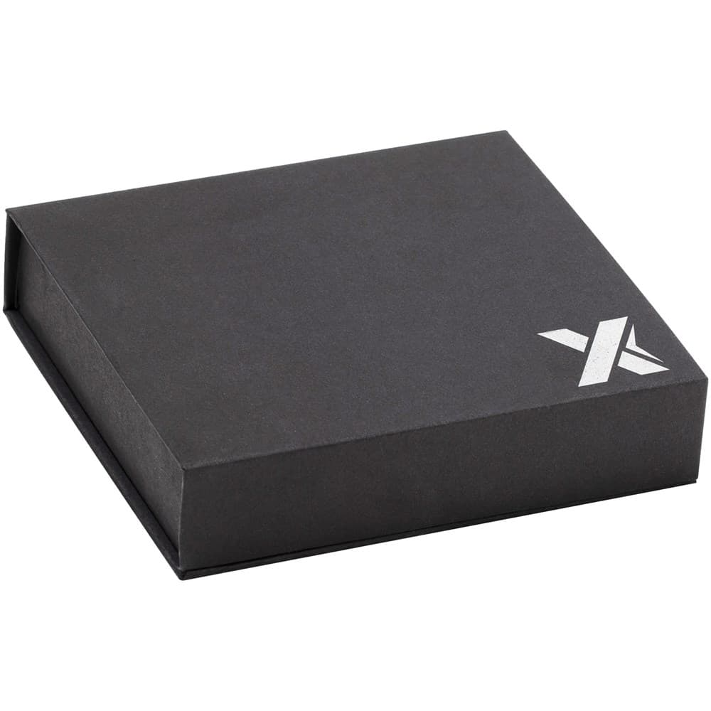 10W rubberen draadloos laadstation met antibacteriële behandeling en oplichtend logo en een oplaadkabel gemaakt van RPET. Geleverd in een zwarte geschenkverpakking met magnetische sluiting. Patent EUROPE EUIPO.