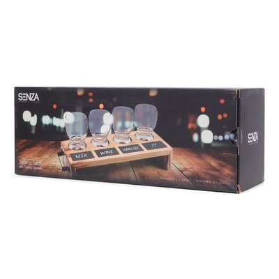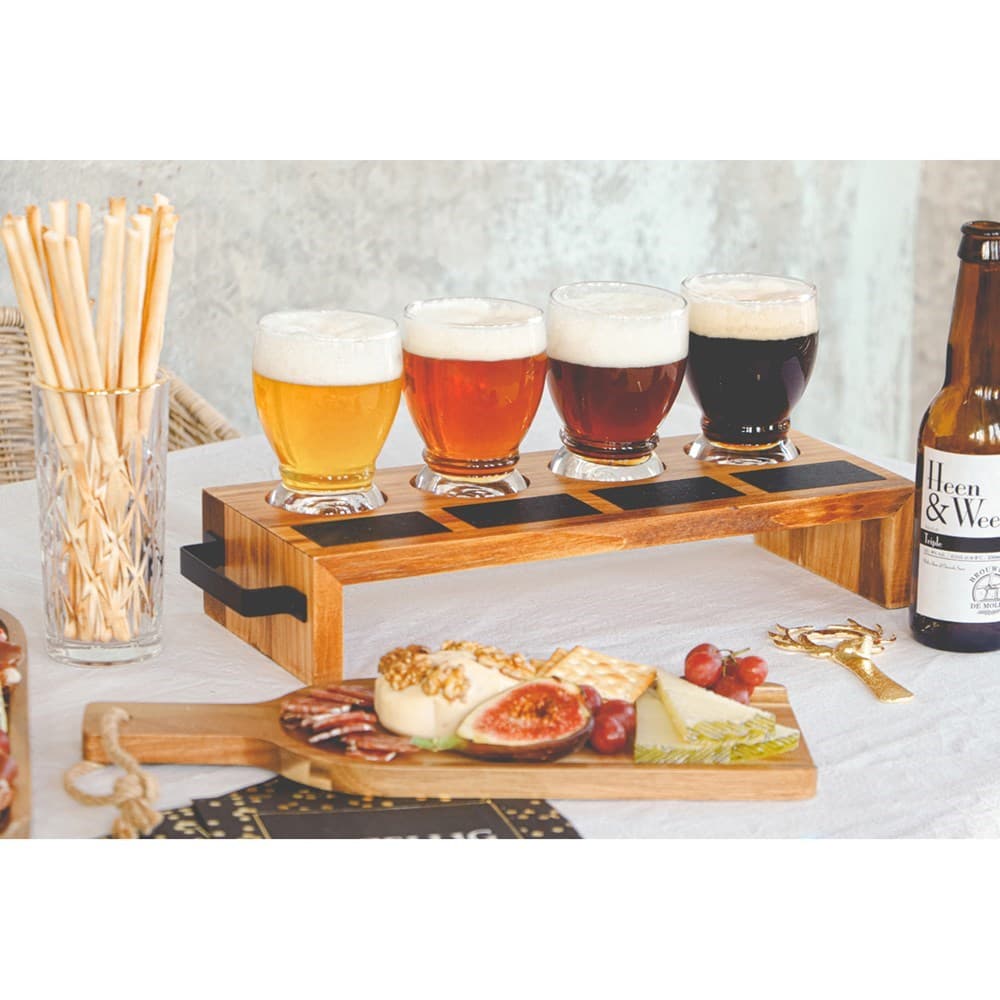 Met deze luxe Tasting Table kun je op originele wijze 4 dranken serveren. Denk bijvoorbeeld aan 4 verschillende soorten whiskey of bier! De bijgeleverde proefglazen passen precies in de ronde inkepingen op de plank waardoor ze stabiel blijven staan. Tevens zorgen de metalen handvatten voor een stevige houvast en een stoere uitstraling. Met de krijtvlakken en het bijgeleverde krijtje kun je gemakkelijk de namen en/of beoordeling per drankje noteren. Kortom een ware eyecatcher voor op de tafel tijdens een borrel!