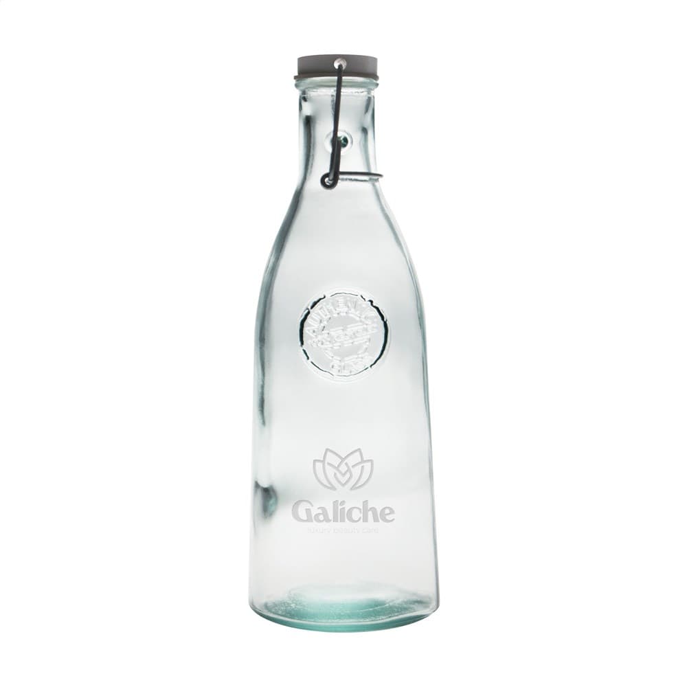 WoW! Decoratieve beugelfles van 100% gerecycled, stevig kwaliteitsglas. Afsluitbaar met een beugeldop. Een gezellige tafelfles met karakter. Het glas wordt gekenmerkt door de reliëftekst: 'Authentic Glass 100% recycled'. De blauwgroene tint van het glas is een natuurlijke eigenschap van gerecycled glas. De kleur en mogelijke oneffenheden benadrukken de schoonheid van imperfectie en dragen bij aan de authenticiteit van dit product. Recycling vermindert het verbruik van nieuwe grondstoffen, water en energie. Kleur, dikte en formaat kunnen per product verschillen. Made in Spain. Inhoud 1.000 ml.