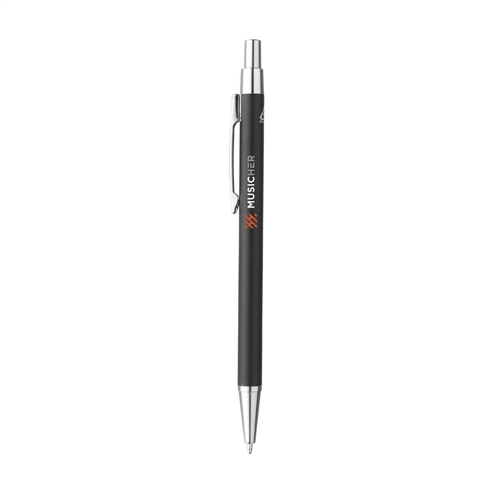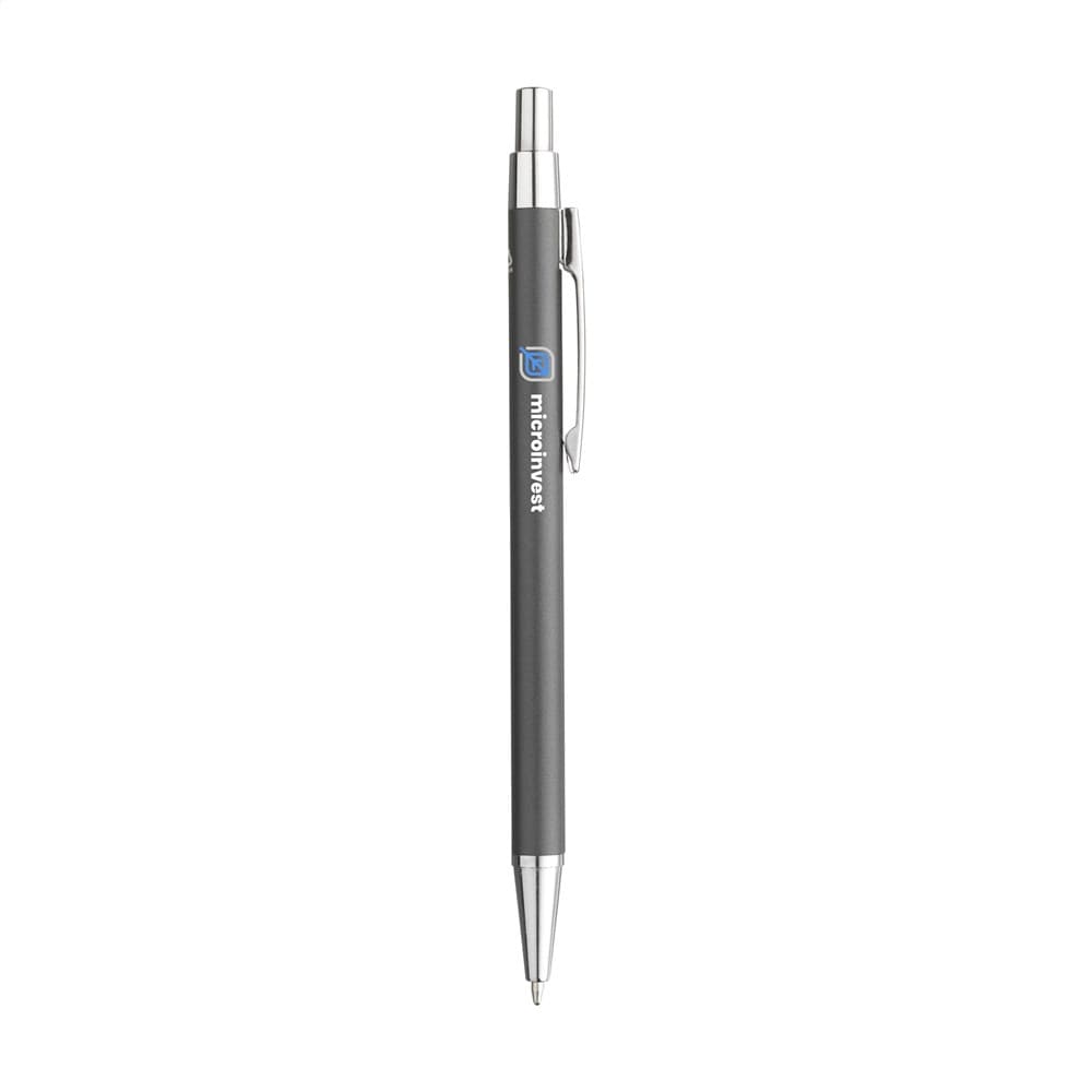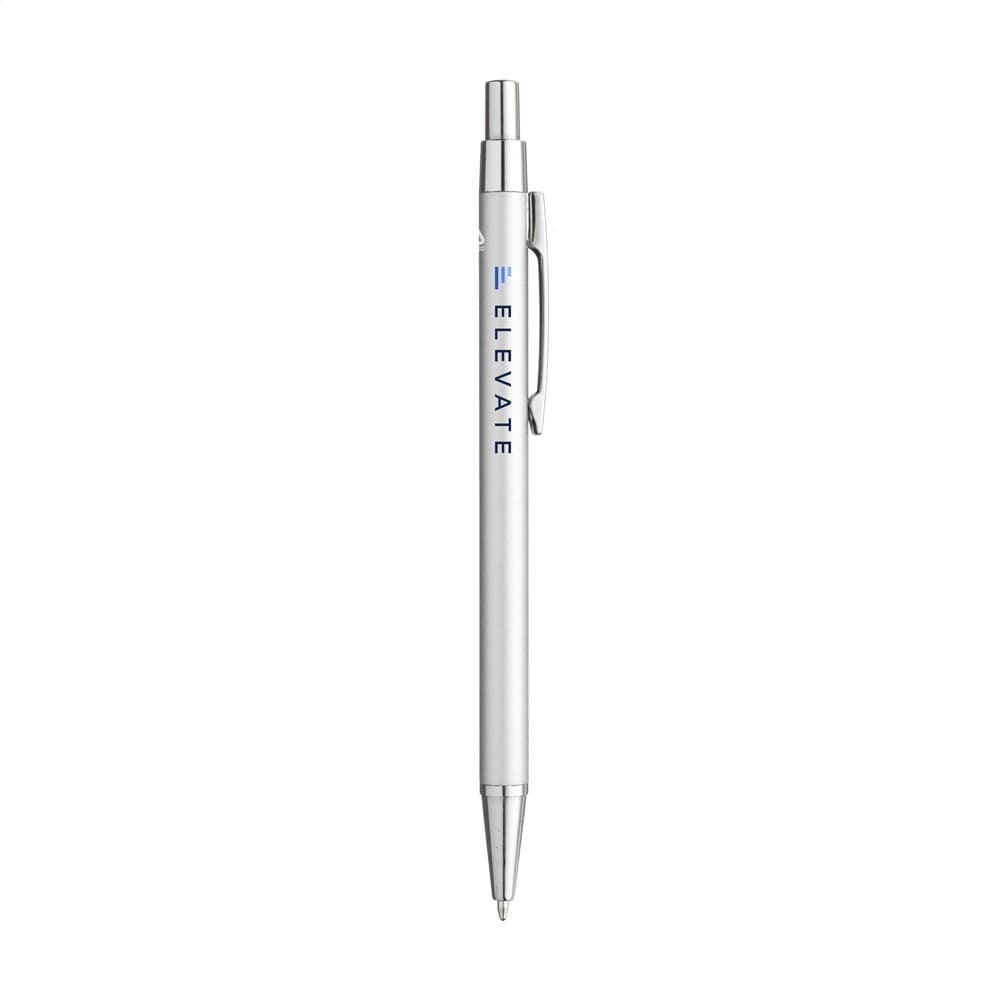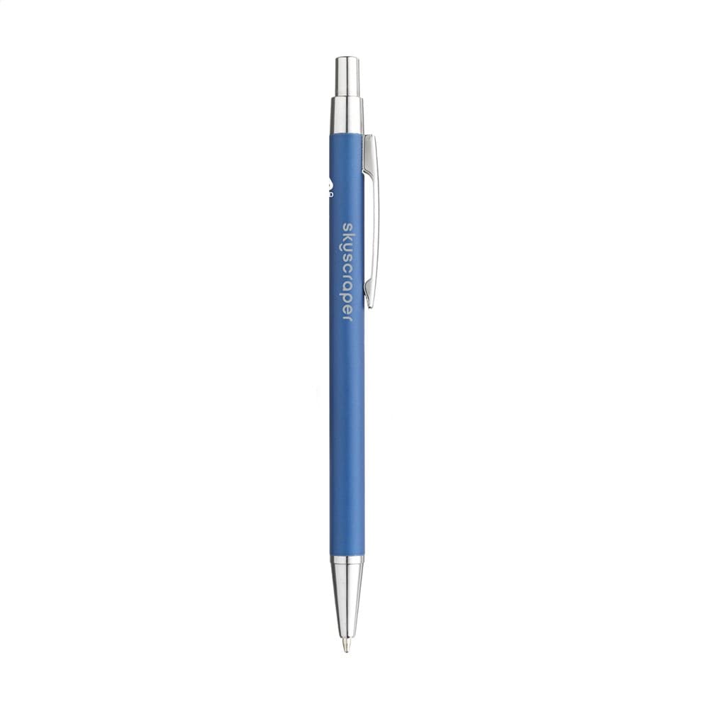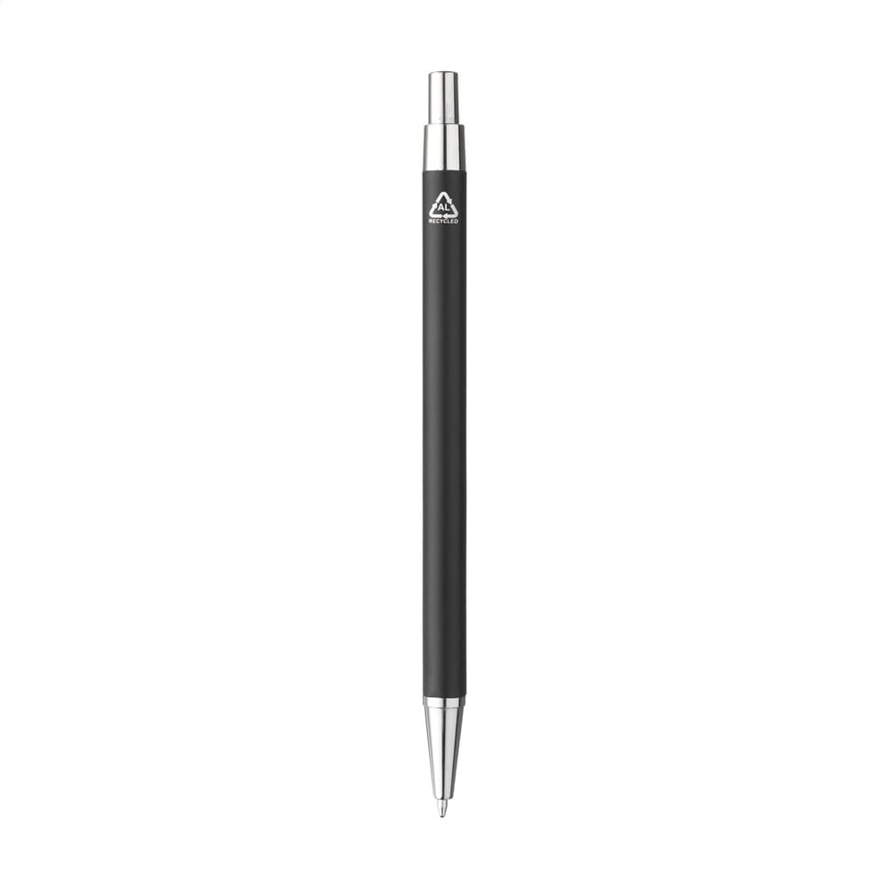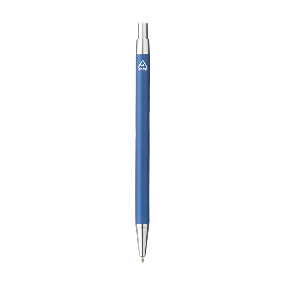 WoW! Duurzame, blauwschrijvende balpen met een slanke houder van aluminium schrootafval. De houder van deze pen bestaat uit 85% gecertificeerd, gerecycled aluminium. Met stevige metalen clip en drukknop.