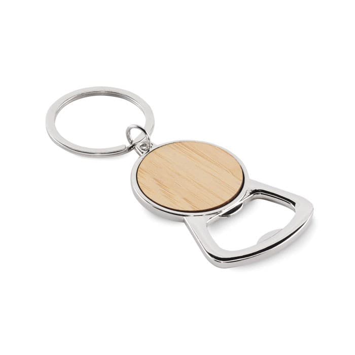 Metalen sleutelhanger met flesopener en bamboe detail.