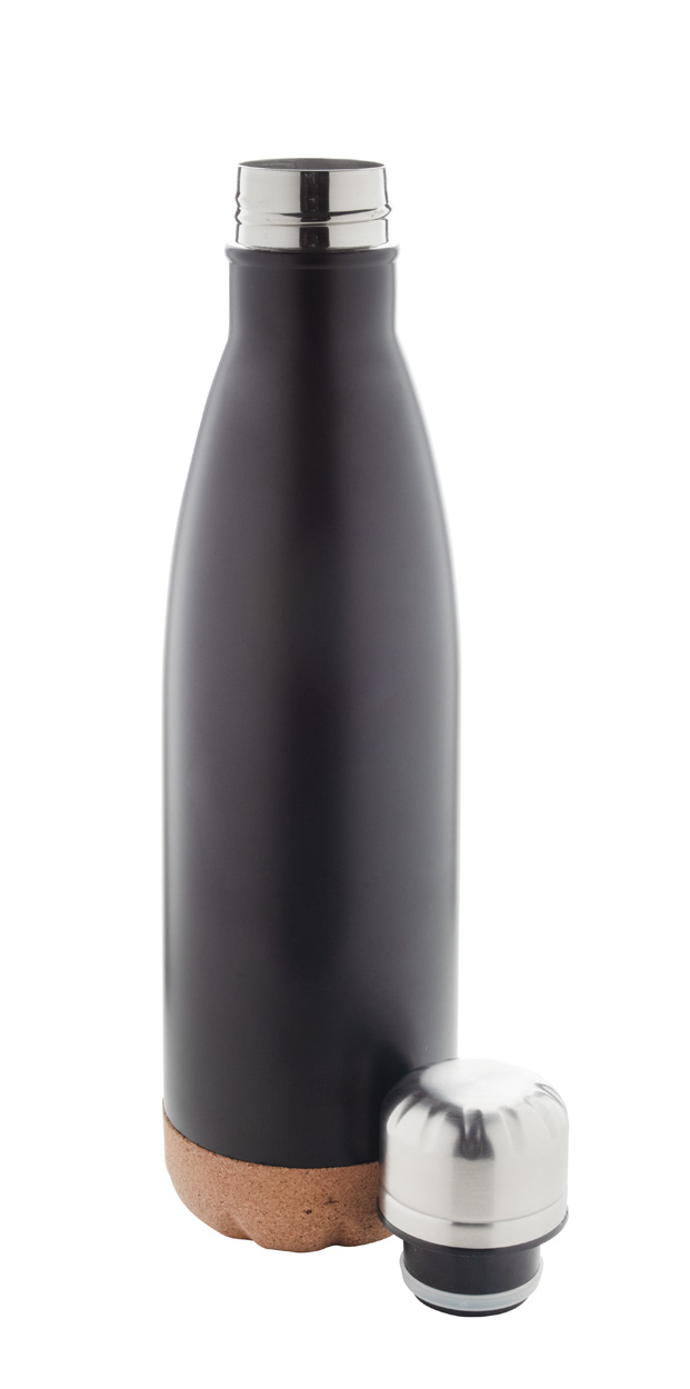 Flesvormige, dubbelwandige roestvrijstalen, geïsoleerde thermoskan met kurken bodem. 500 ml.