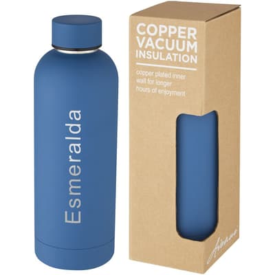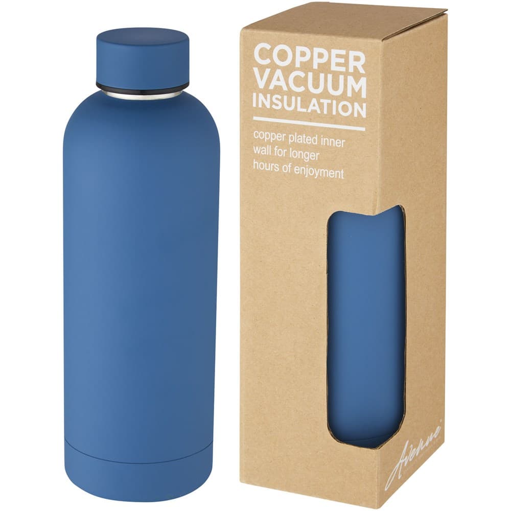 Koperen vacuümgeïsoleerde roestvrijstalen fles met strak ontwerp. De geïsoleerde 18/8 roestvrijstalen constructie voorkomt condensatie aan de binnenkant van de fles en door de trendy matte poederlakafwerking is de fles extra duurzaam. BPA-vrij, getest en goedgekeurd volgens de Duitse voedselveiligheidswetgeving (LFGB). Getest en goedgekeurd voor ftalaten volgens de REACH-regelgeving. Inhoud 500 ml. Handwas aanbevolen. Geleverd in een gerecycled kartonnen geschenkverpakking.