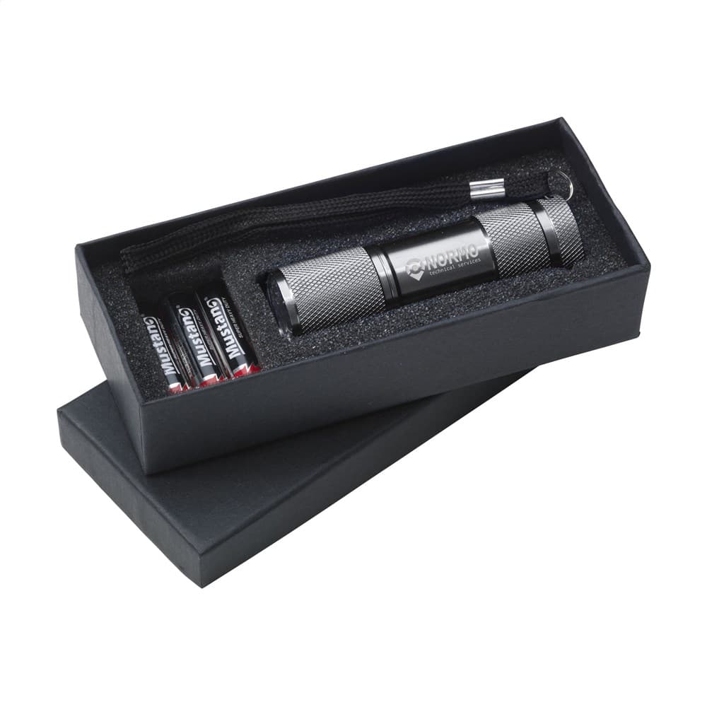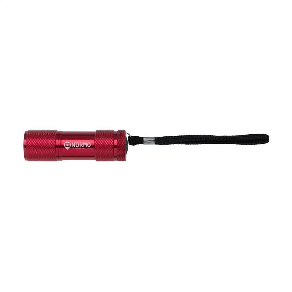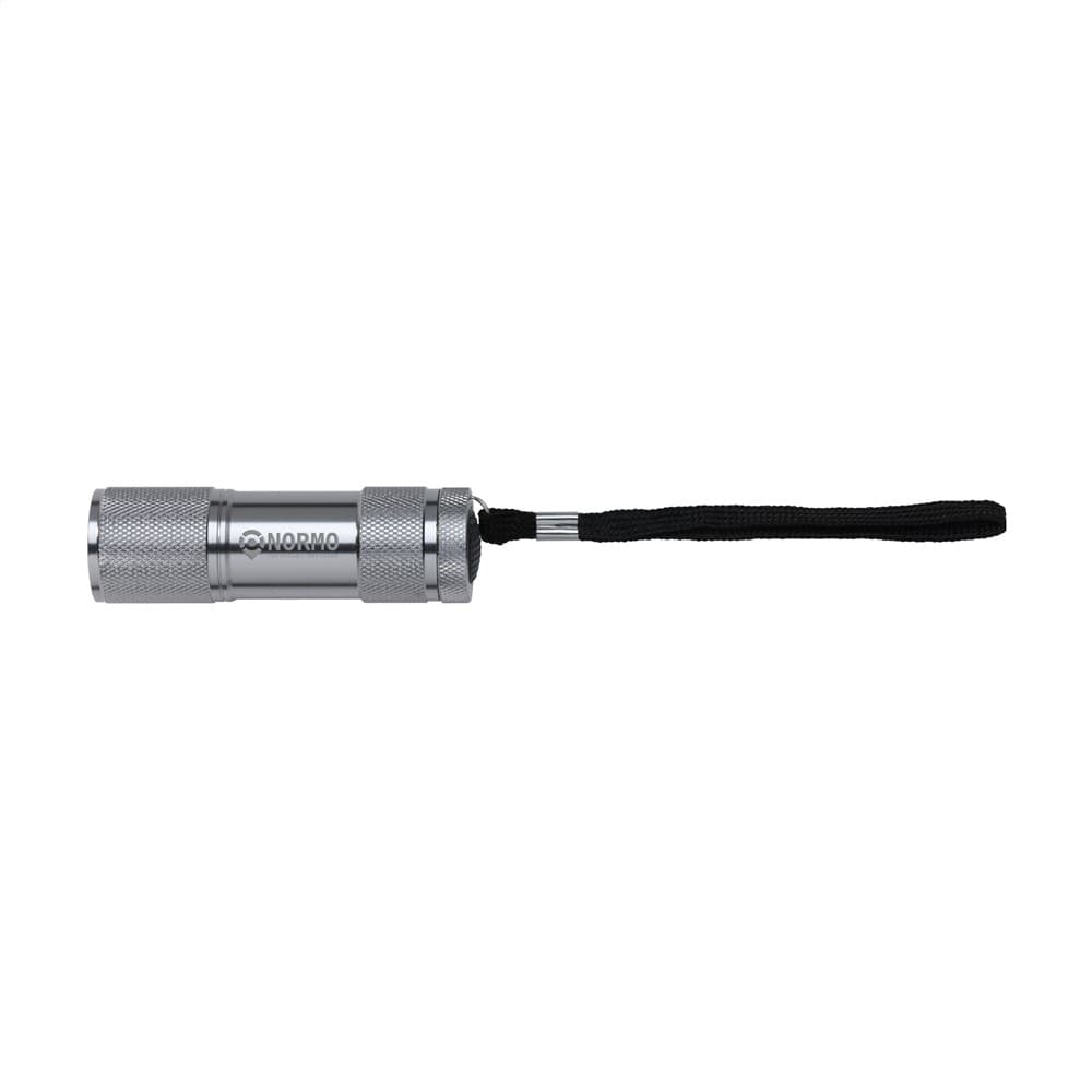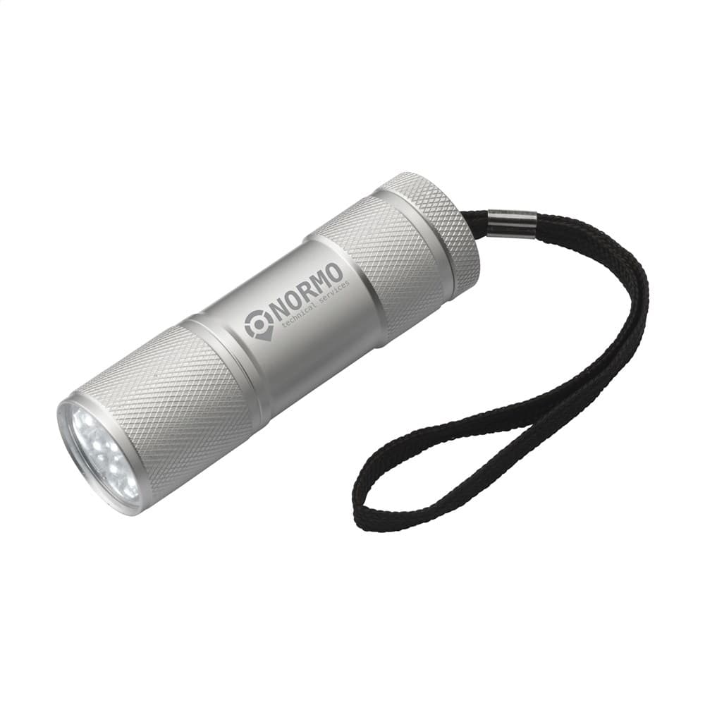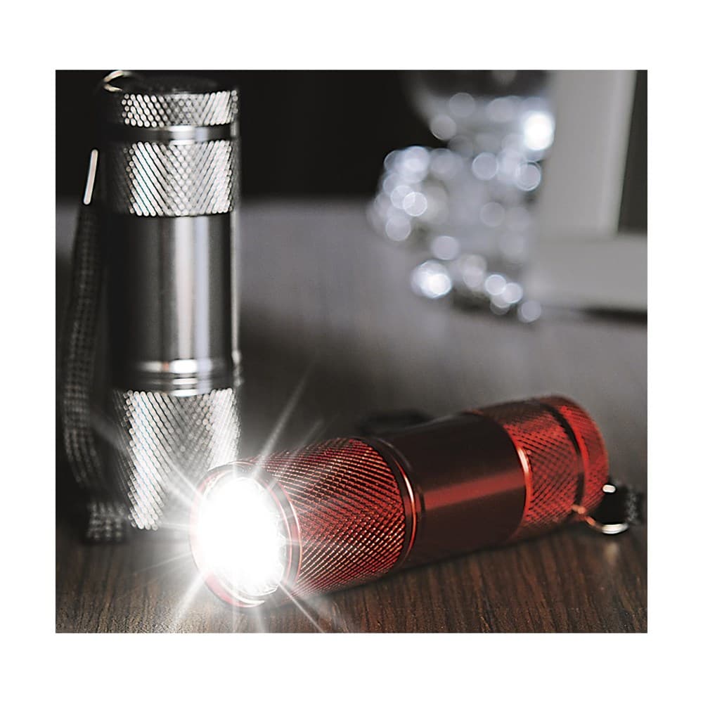 Aluminium staaflampje met 9 felwitte, energiezuinige LED-lampjes en afneembare lus. Afm. Ø 2,7 x 9 cm. Incl. batterijen. Per stuk in doos.