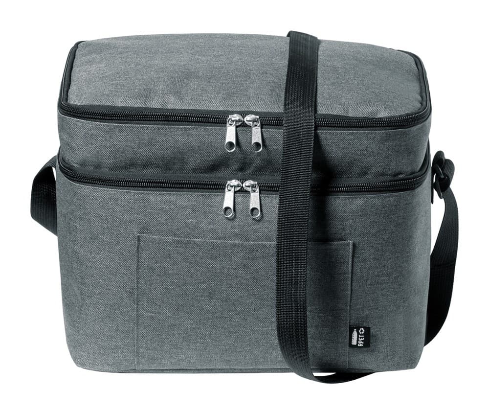 600D RPET polyester koeltas met PEVA vulling, met 2 ritsvakken en verstelbare schouderriem. Met kenmerkend RPET-label.