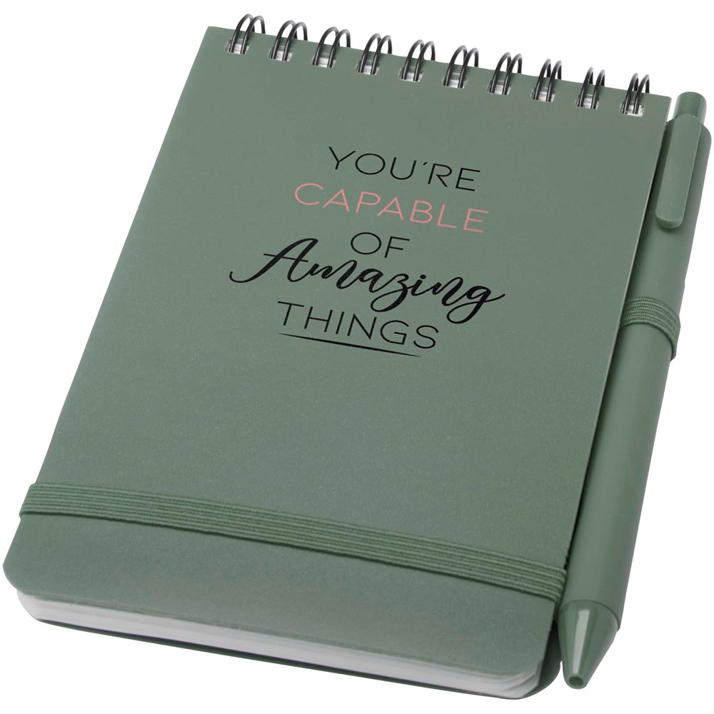 Het Thalaasa A6 notitieboek met harde kaft is gemaakt van ocean-bound plastic en heeft 80 gelinieerde vellen crèmekleurig papier van 70 g/m². Het notitieboek heeft afgeronde hoeken, een elastische sluiting en een pennenlus. De balpen met zwarte inkt is ook gemaakt van gerecycled plastic uit de oceaan. Schrijflengte: 1000 meter. Stiftmaat: 1,0 mm.