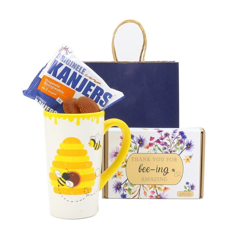 In dit pakket vind je de favoriete bloemenzaden voor zowel bijen en vlinders. Deze bloemen zitten namelijk boordevol stuifmeel en pollen, die de natuur nodig heeft om te floreren. Bijen en vlinders zijn heel belangrijk voor onze voedselvoorziening: een groot deel van de voedselproductie, waaronder zaadteelt, is afhankelijk van bestuiving door onder andere bijen en vlinders. INHOUD: • Royale mok met bijen decor, 400 ml • Doosje “Thank you for BEE-ING amazing” met bijen & vlinder bloem zadenmix & potgrond • Pak met 2 Kanjer stroopwafels, 80 gram • Verpakt in een papieren geschenktas. Besteleenheid: 12 stuks. Levertijd 2-3 weken.