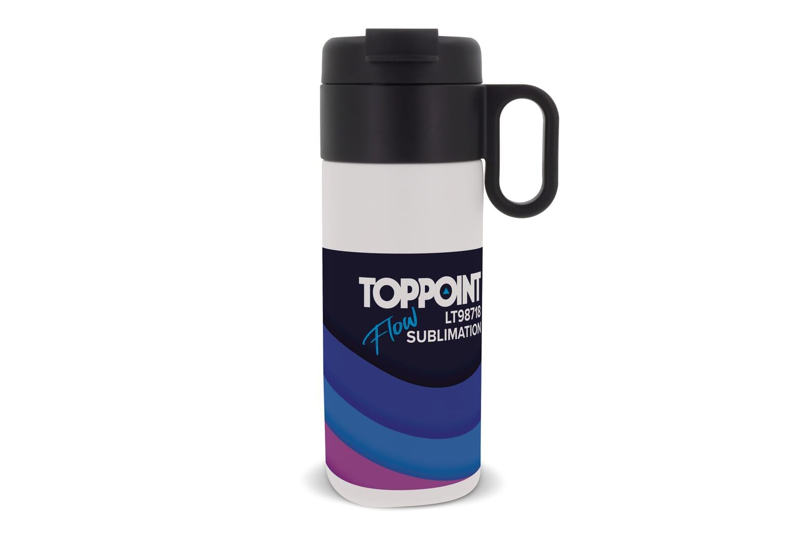 Dubbelwandig vacuüm geïsoleerde beker uit de Toppoint design 'Flow' serie. De mok met klapdeksel is 100% lekvrij en eenvoudig mee te nemen. Zowel de binnenwand als de buitenwand van de mok bestaan uit RVS en is van zeer hoogwaardige kwaliteit. Daardoor blijft het drinken langer op de gewenste temperatuur. Het handvat maakt het eenvoudiger om te dragen. Geschikt voor sublimatiedruk. Dranken blijven tenminste 12 uur warm of 24 uur koud. Wordt geleverd in geschenkverpakking. Perfect voor thermosflessen bedrukken.