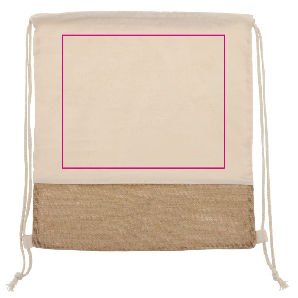 Tas van jute en katoen, geschikt om je spullen in te dragen. Met het trekkoord dat vast zit aan de tas kun je deze eenvoudig op je rug meedragen.