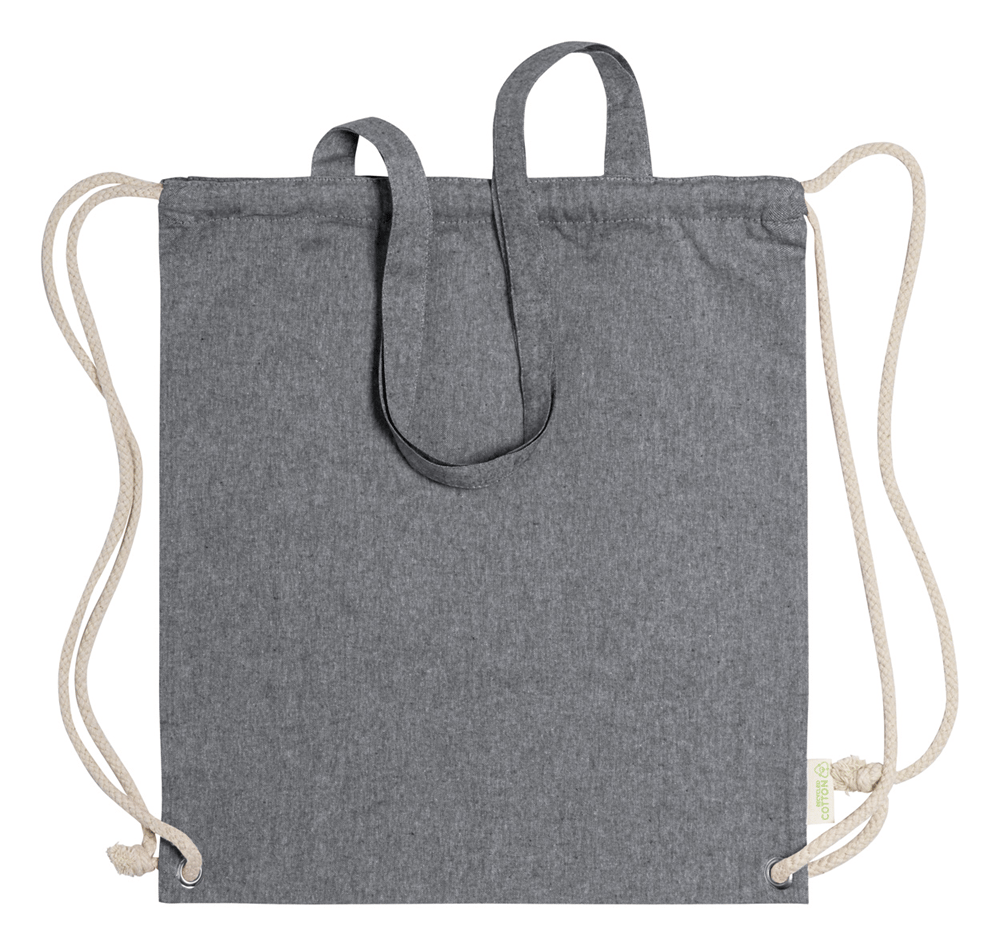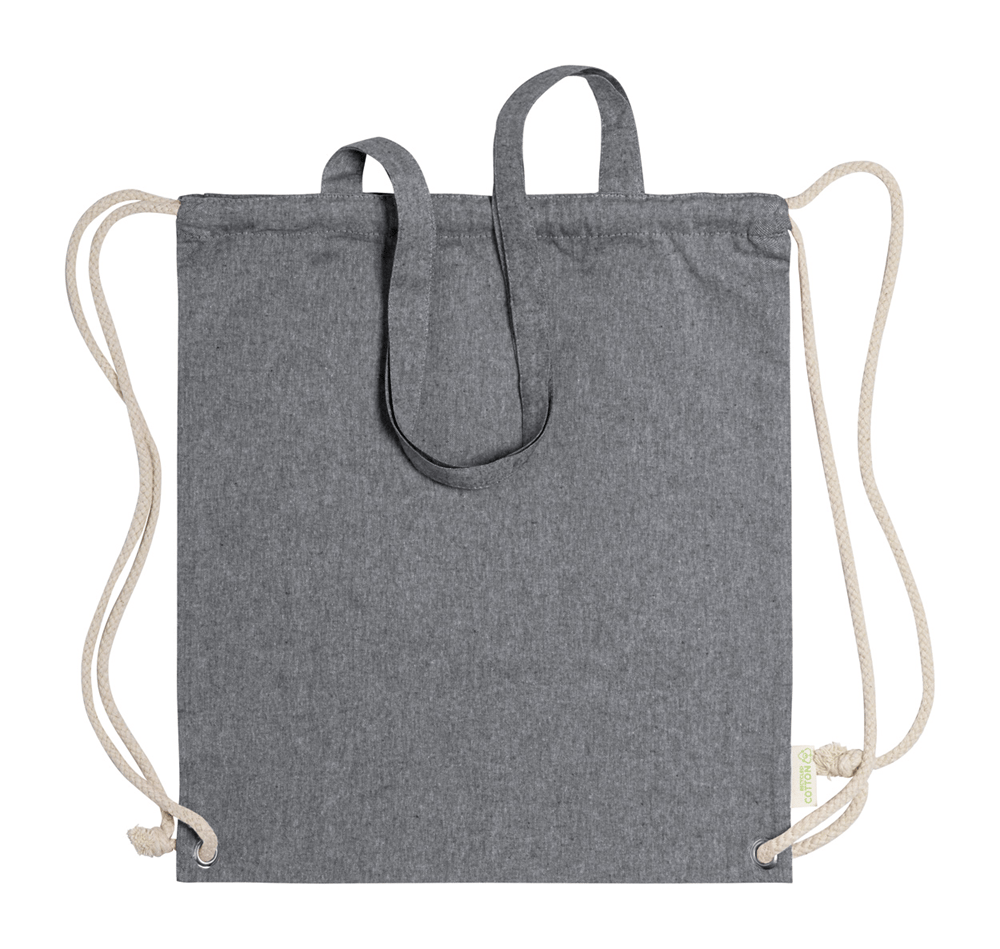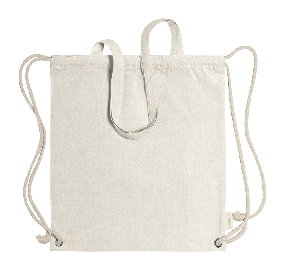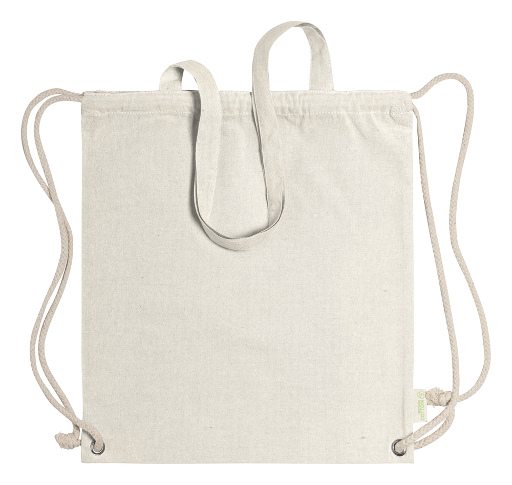Tas van gerecycled katoen met trekkoord, dikke gevlochten koorden en lange hengsels. Kan ook als boodschappentas worden gebruikt. 100% gerecycled katoen, 140 g / m².