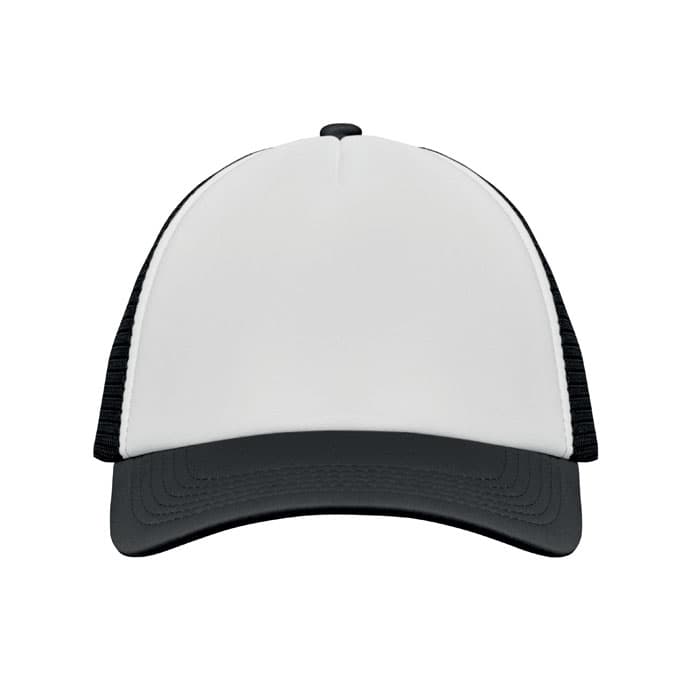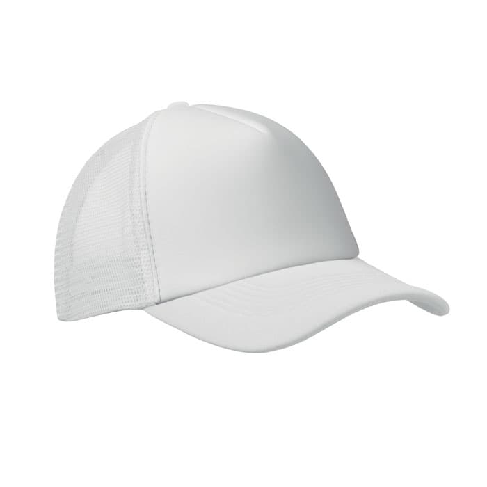 Truckers baseball cap van polyester 140-150 gr/m2 met verstelbare sluiting. Witte voorzijde en gekleurde klep van polyester jersey met schuimrug. 5 Panelen. Andere panelen in gekleurde mesh. Size 7 1/4.