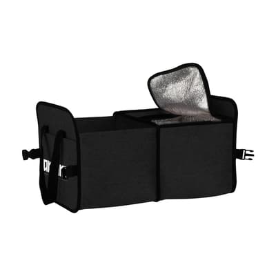WoW! Praktische, opvouwbare organizer met koelvak, voor in de kofferbak van je auto. Van stevig, milieuvriendelijk RPET vilt (gemaakt van gerecyclede PET-flessen). Voorzien van een opbergcompartiment met bodemplaat en een afsluitbaar, ruim koelvak. Met extra voorvak en een mesh zijvak voor extra opbergruimte. Deze organizer is ideaal voor het opbergen van bijv. oplaadkabels en het koel opbergen en vervoeren van boodschappen. Afm. uitgevouwen 31 x 28 x 48 cm. Afm. opgevouwen 31 x 28 x 6 cm. Inhoud ca. 41 liter. 684 g.