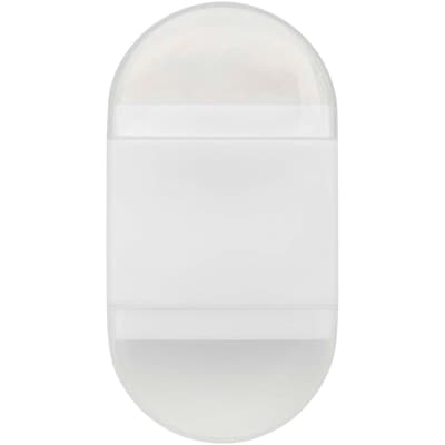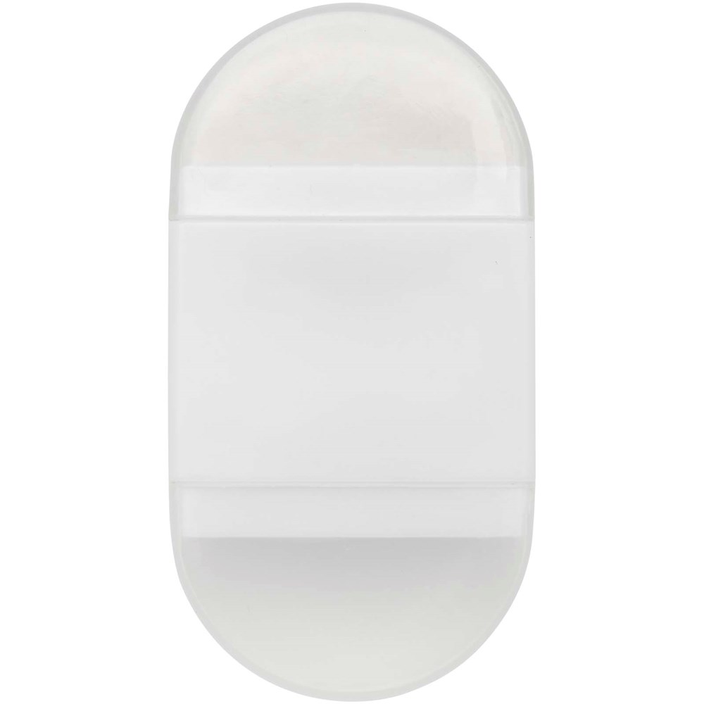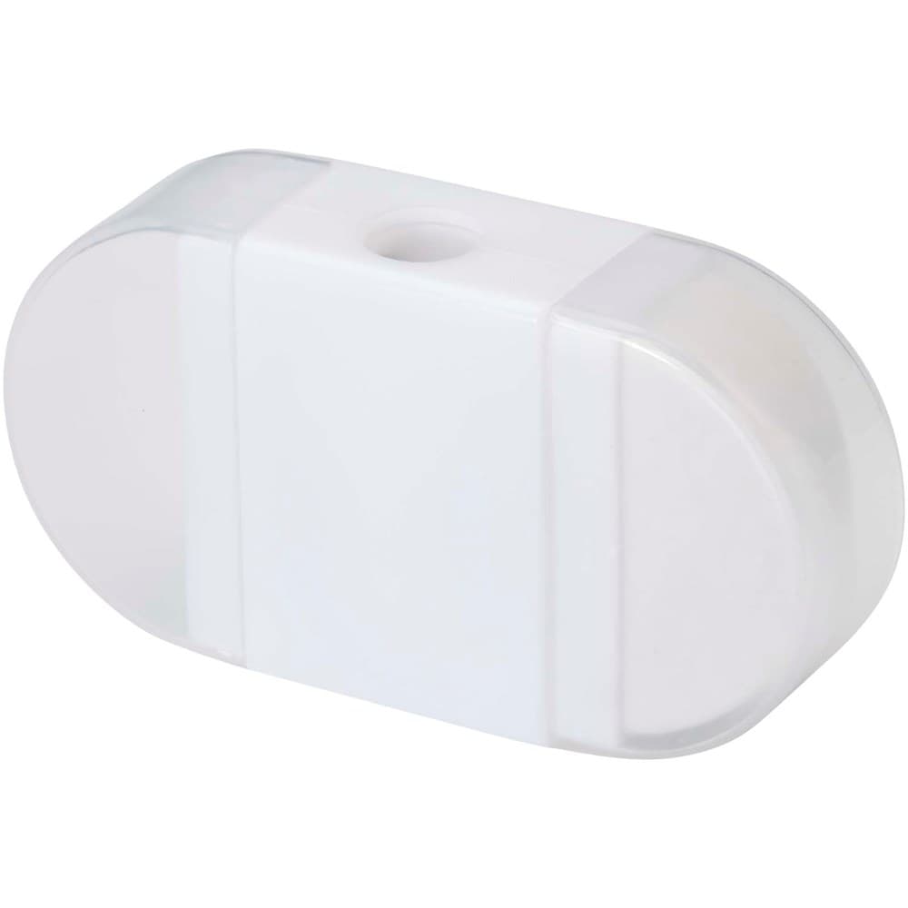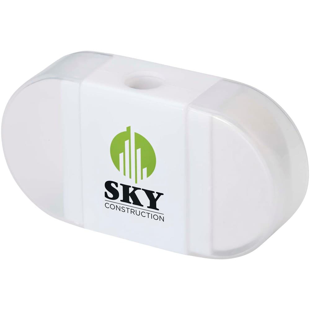 Puntenslijper met gum en met transparante dopjes aan beide zijden. Afmetingen: 6,2 x 3,3 x 1,6 cm.