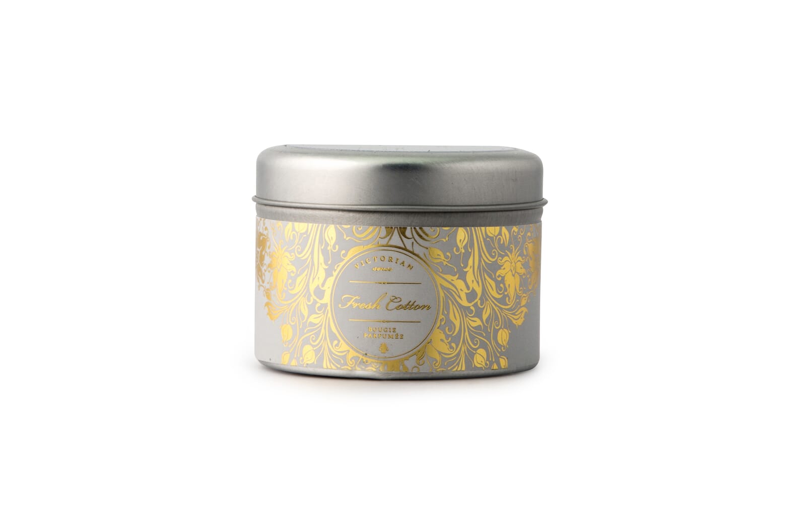 Een geurkaars in blikje van het Zweedse merk Victorian, Het blikje is voorzien van een metalen deksel. De geurkaars heeft de geur van vers gewassen katoen. Brandtijd 12 uur.