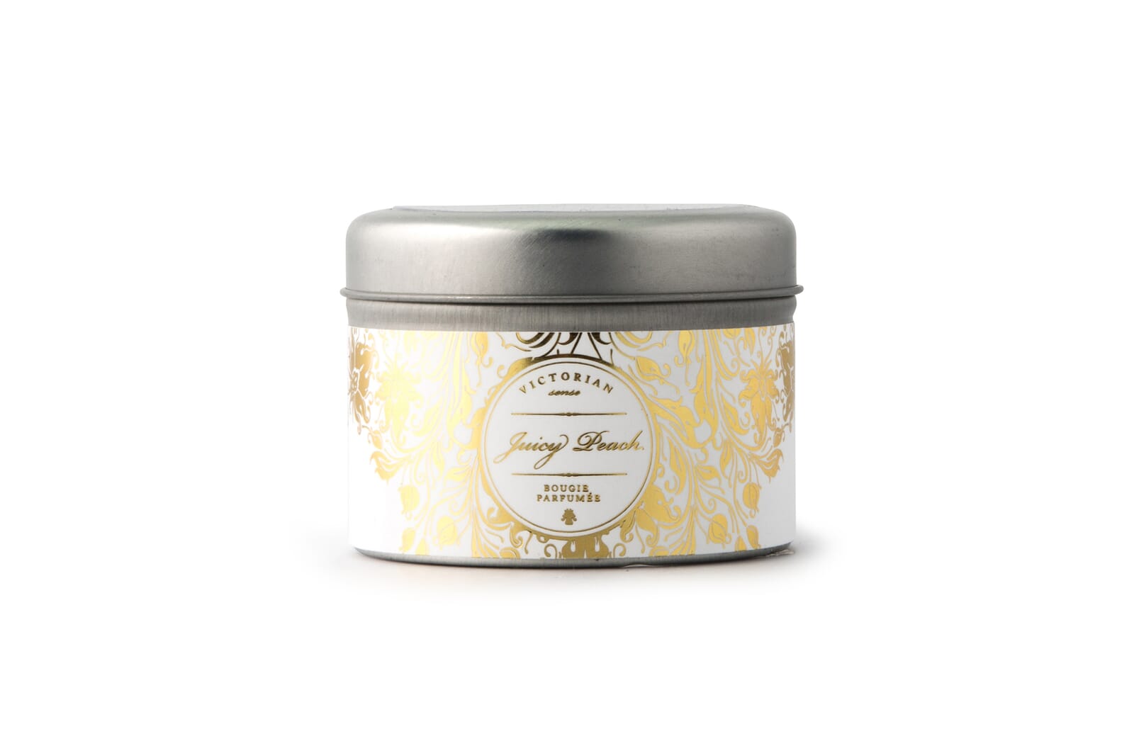Een geurkaars in blikje van het Zweedse merk Victorian, Het blikje is voorzien van een metalen deksel. De geurkaars heeft de geur van de frisse en zoete geur van perzik. Brandtijd 12 uur.